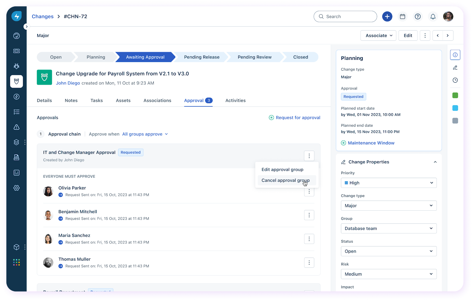 Approval groups can be edited to add or remove approvers or cancelled entirely. To modify an approval group, click the 3-dot icon and click Edit approval group. This allows you to add or remove approvers from the approval group. Edits made to the approval group impact only the approval group. It does not affect the overall approval chain. If changes are made at the chain level, it impacts the overall chain.