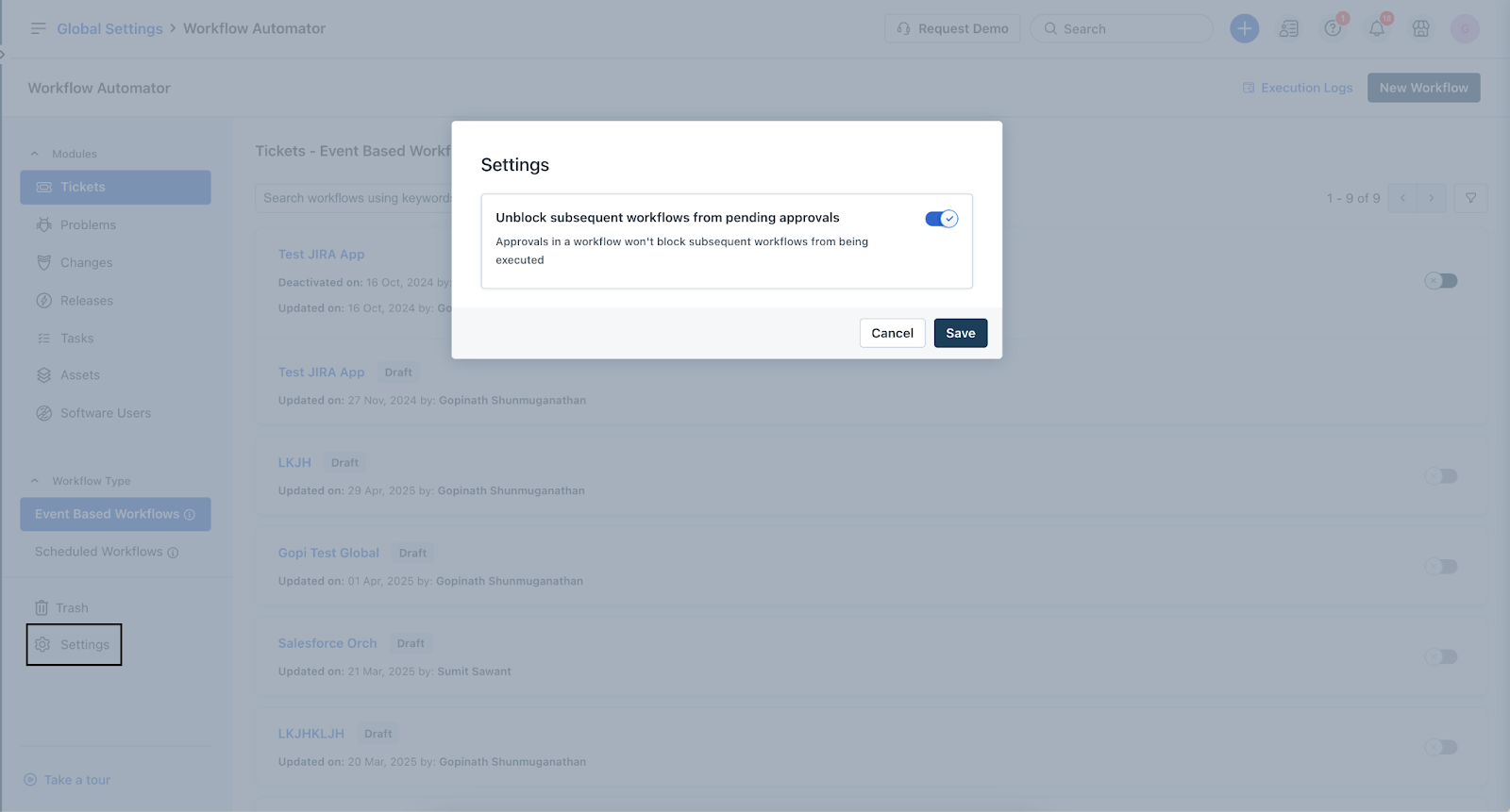 - For existing users: Non-blocking workflow execution is currently available for early access. To enable this feature, please contact the Freshservice support team.