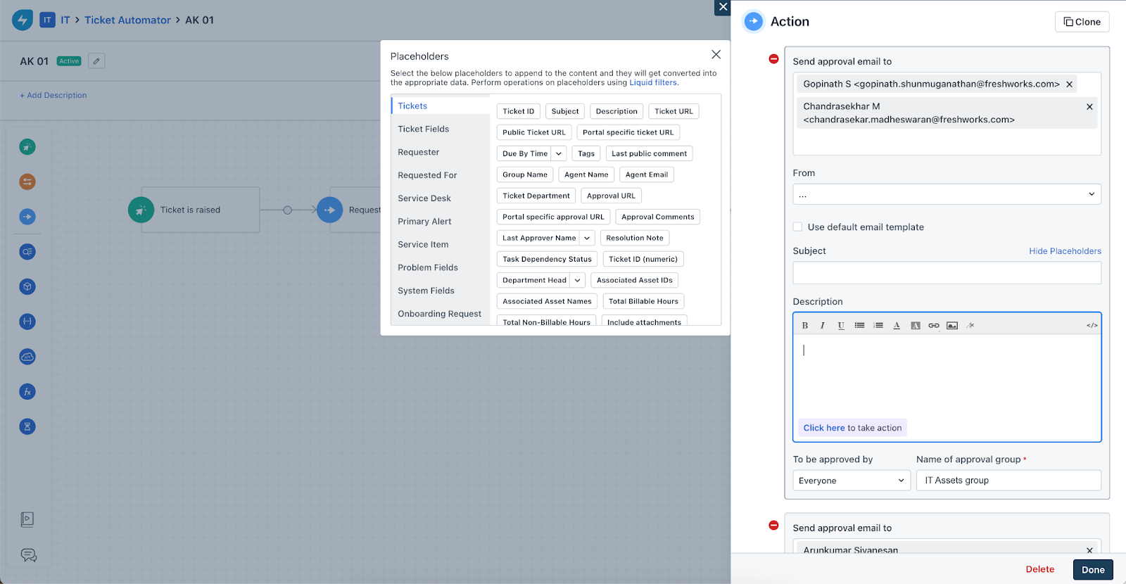 Select ‘Request for Approval’ from the dropdown and define the users/teams to whom the approval email will be sent. Assign the approval rule and add a name to the approver group. You can select between 4 approval rules: Everyone, Anyone, Majority, or First Responder.