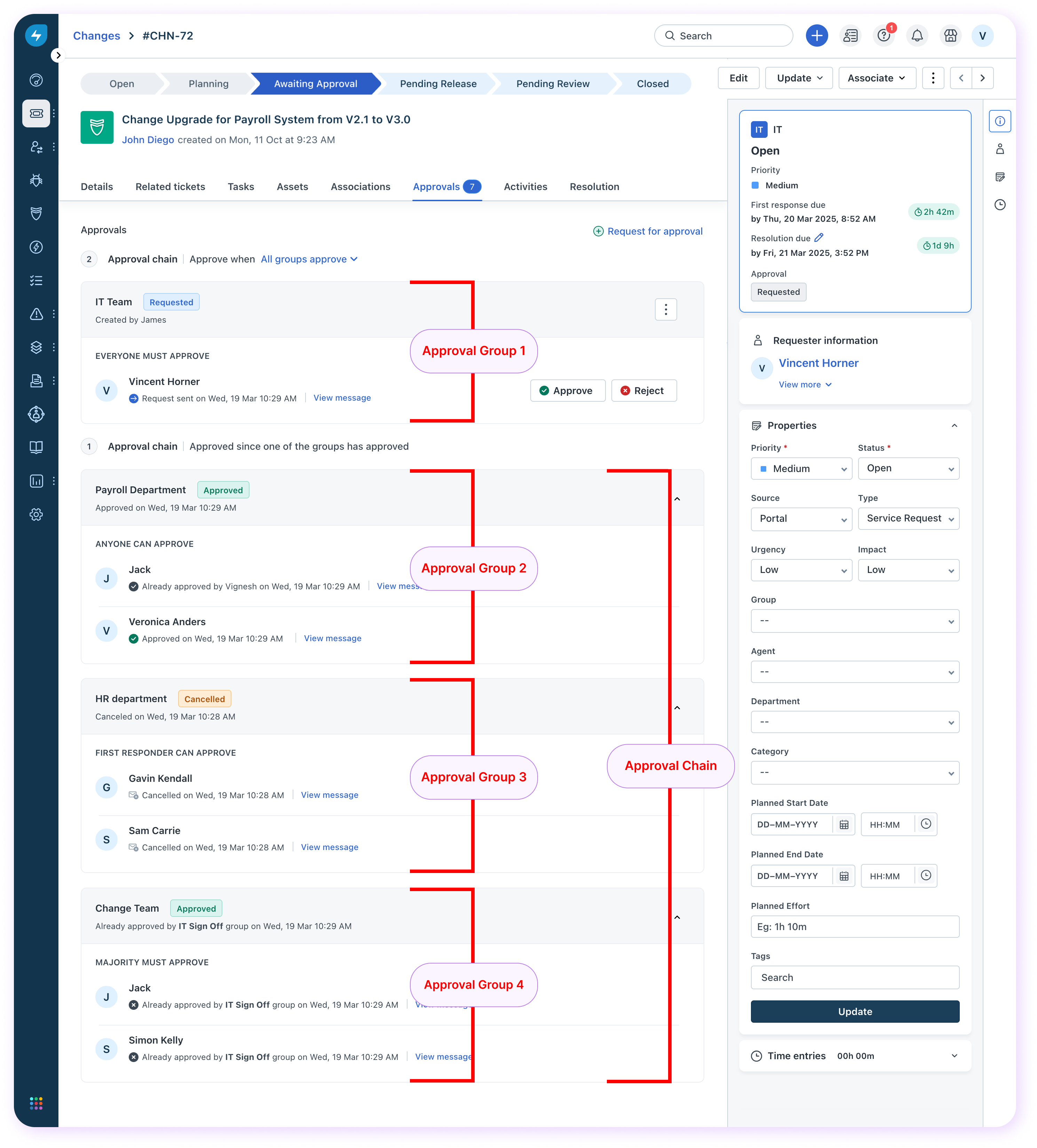 - The ticket or change approval status changes only when the chain is approved, rejected, or canceled.