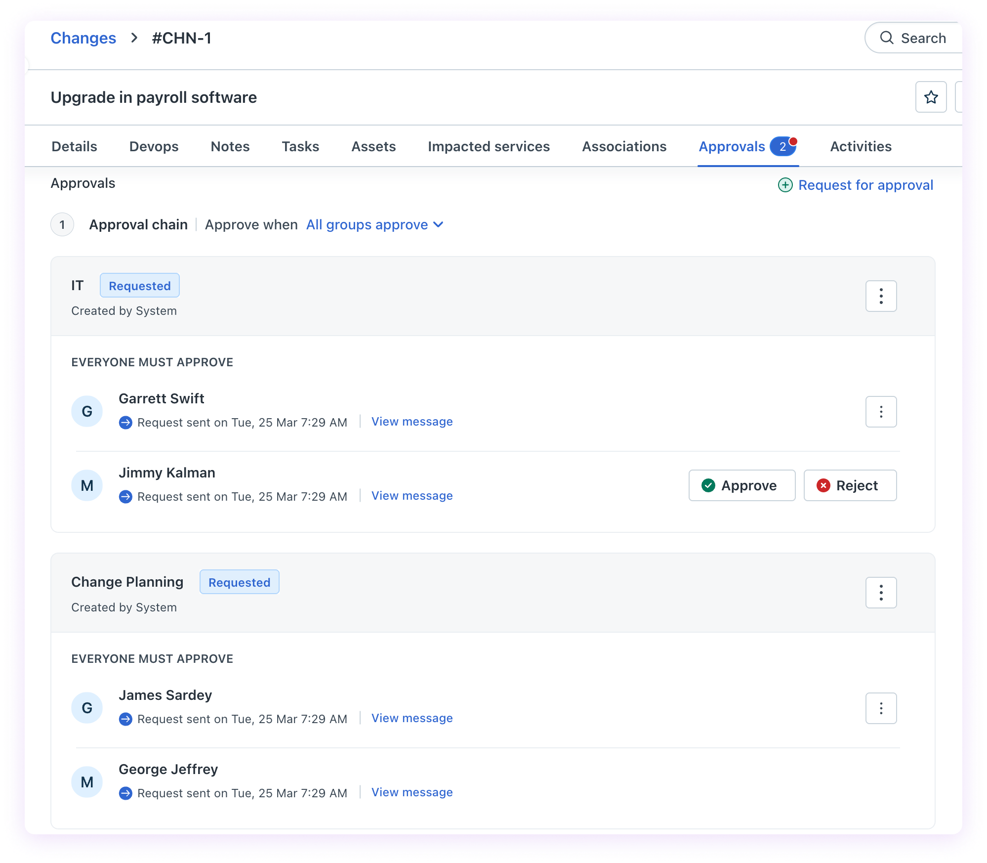 First responding group approves: The chain will be approved/rejected based on whether the first responding group approves/rejects. If the first group to respond marks it as approved, the chain will be approved. If the first group to respond marks it as rejected, the entire chain will be rejected. If the chain get rejected, the approval status of corresponding ticket/change also gets updated as the same.