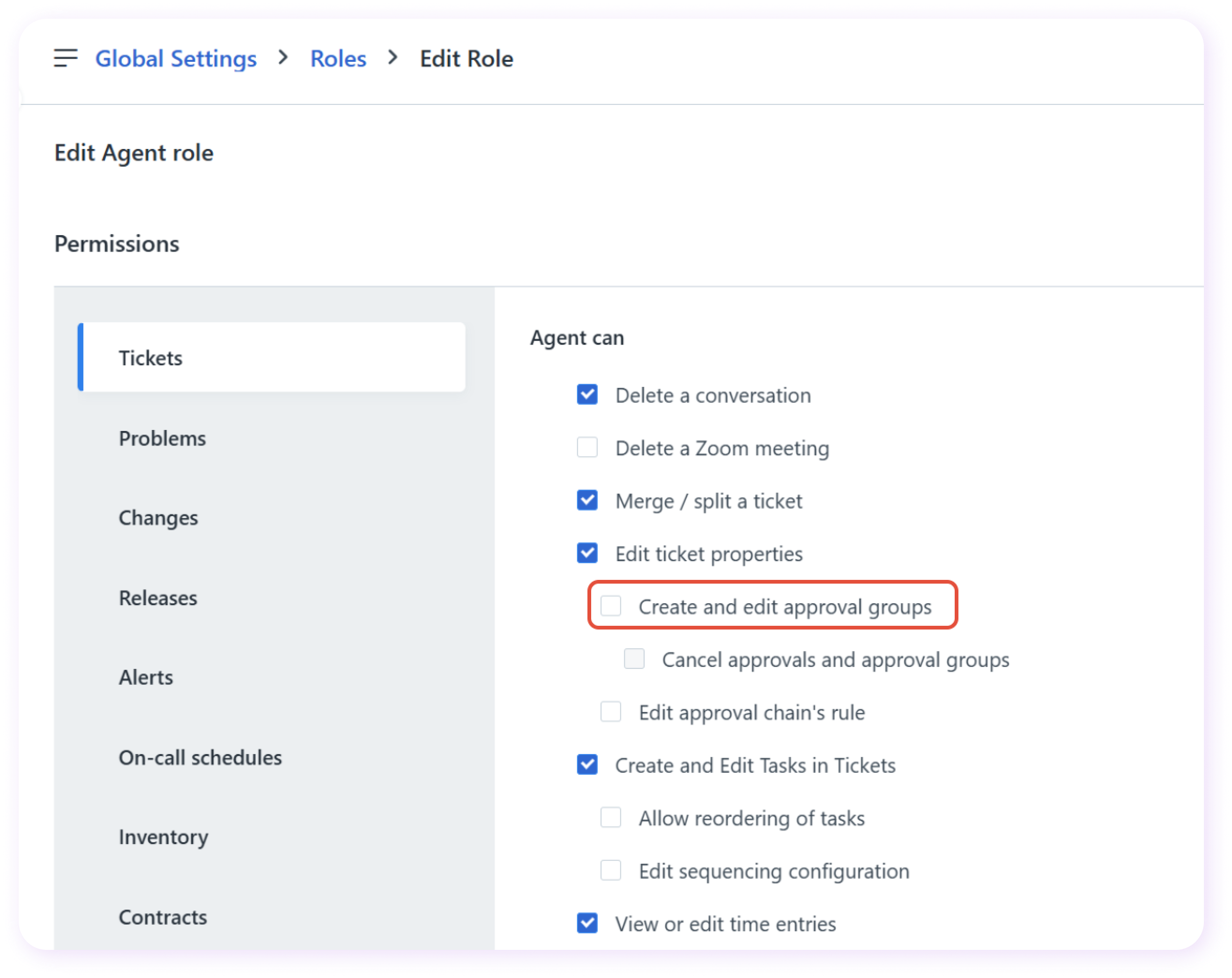 Agents can be granted or revoked permissions to create and edit approval groups. The permissions for the same can be found under Admin Settings > Roles. Admins can also define if agents have permission to cancel approval groups they have created. Similarly, the permission to modify the chain rule can also be found here.