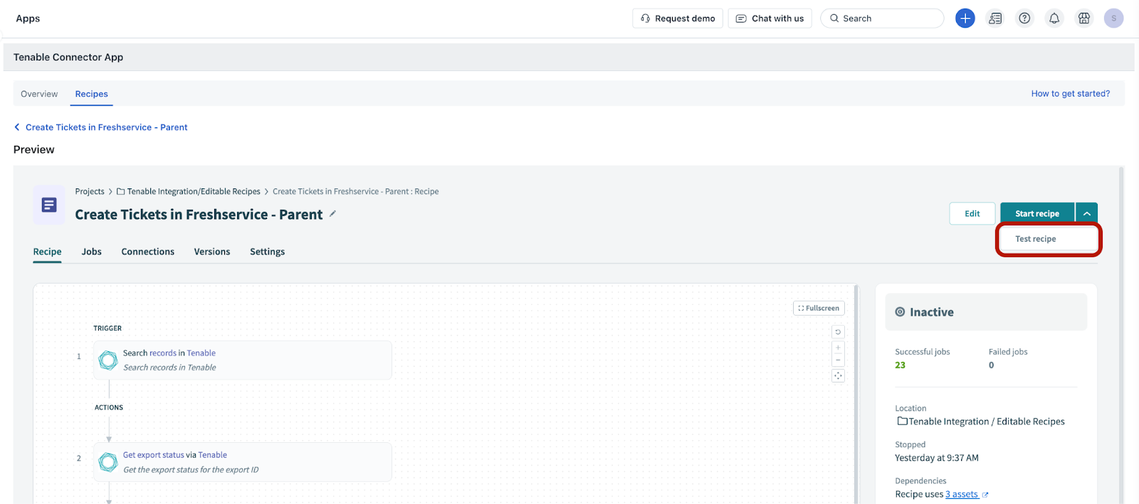 The recipe performs a specific set of actions based on the conditions met. For example, the recipe creates a ticket in Freshservice based on the vulnerability data detected in Tenable.