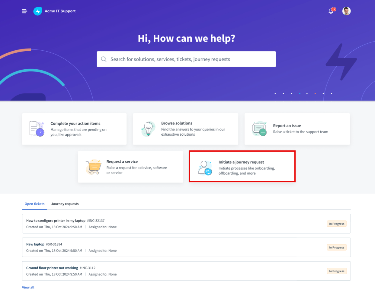 For example, if you select the Employee Onboarding journey, you might need to enter the employee’s name, start date, department, manager details, and other relevant information. The fields vary depending on the journey and its underlying configuration.After filling in all mandatory fields, click Submit. The created journey request will appear under the Journey requests tab, at the bottom of the support portal home page, as shown below.