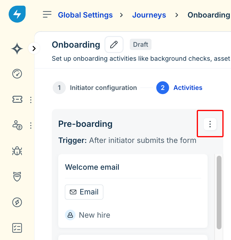 Note: In an onboarding journey, the Initiator and New Hire stakeholders are mandatory and cannot be deleted.Some phases and activities, according to the template selected, will be preconfigured on the Phases/Activities Configuration screen.