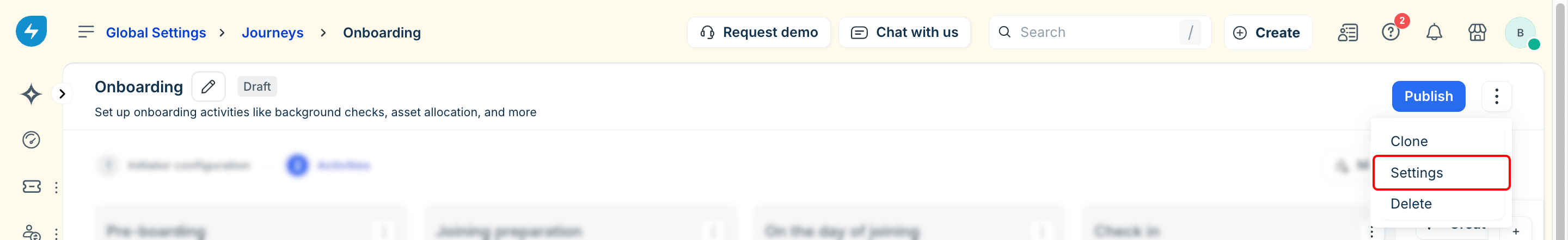 To review the journey-level settings and control various aspects of the journey's function, click the three dots and click Settings, as shown in the image below. For more information about the Journey settings, see Manage Journey Settings.