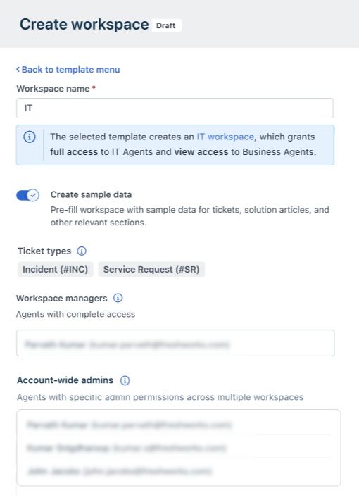 In the workspace creation screen that appears, after providing other details like the workspace name, pre-fill the workspace with sample data and ticket types. Under Workspace managers, select agents to add as Workspace managers.