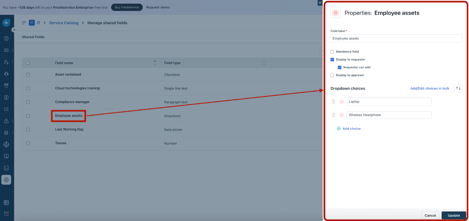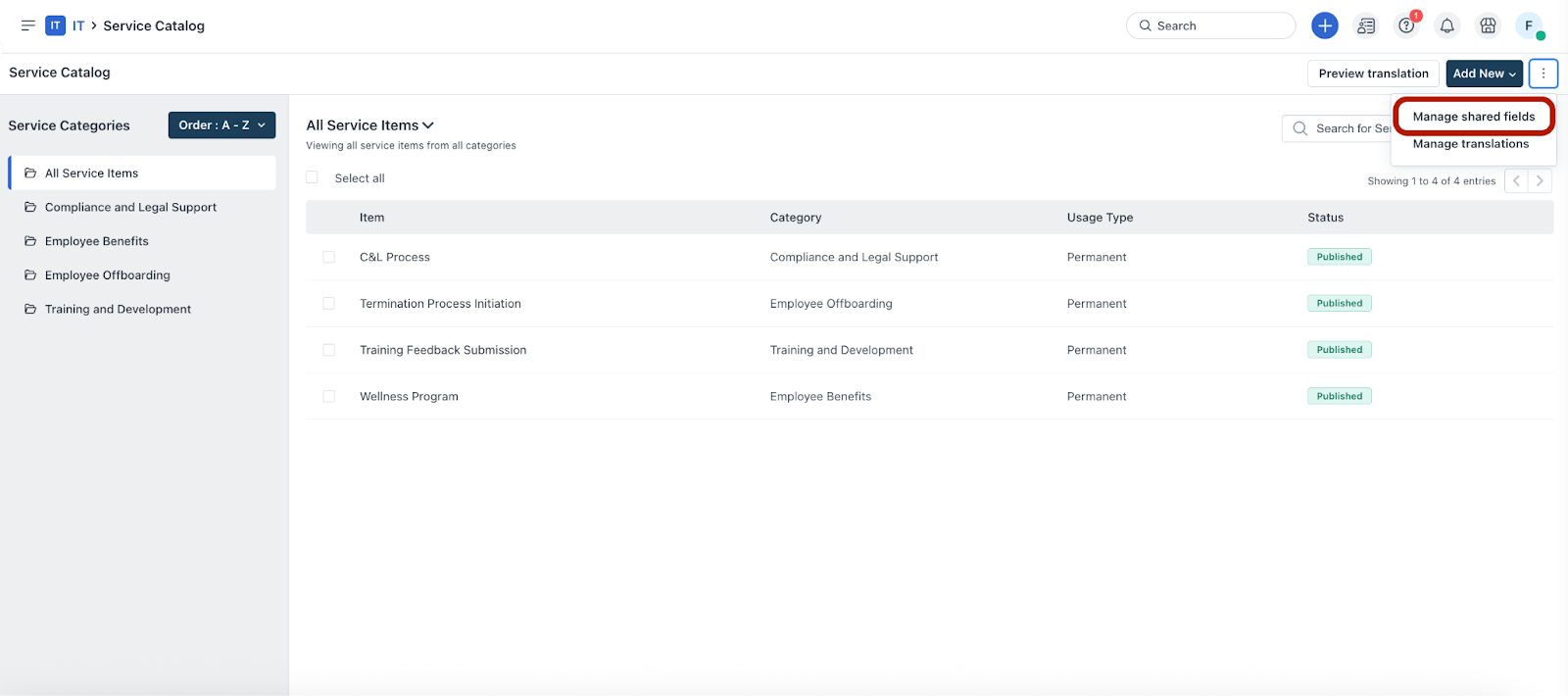 (On the Service Catalog page) From the More options dropdown at the top-right corner, select Manage shared fields.