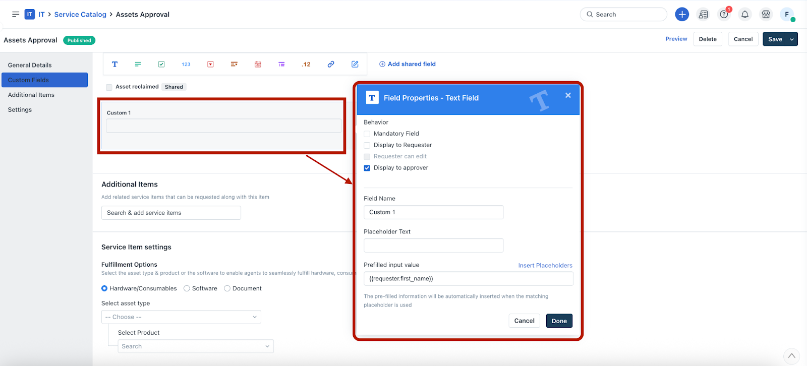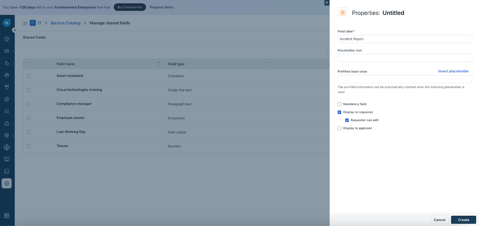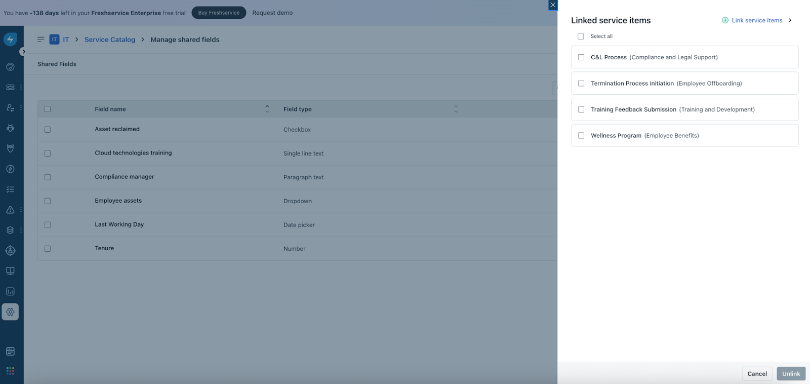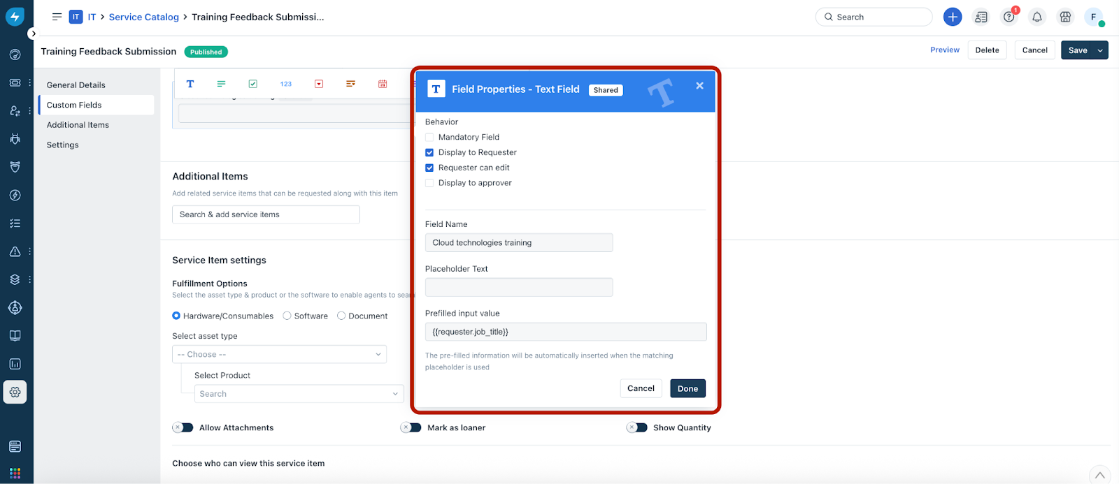 You can now create and manage shared fields for service categories and items within the Service Catalog for various workspaces. This allows for the reuse of fields across multiple service items or categories in a workspace, eliminating the need for recreation.