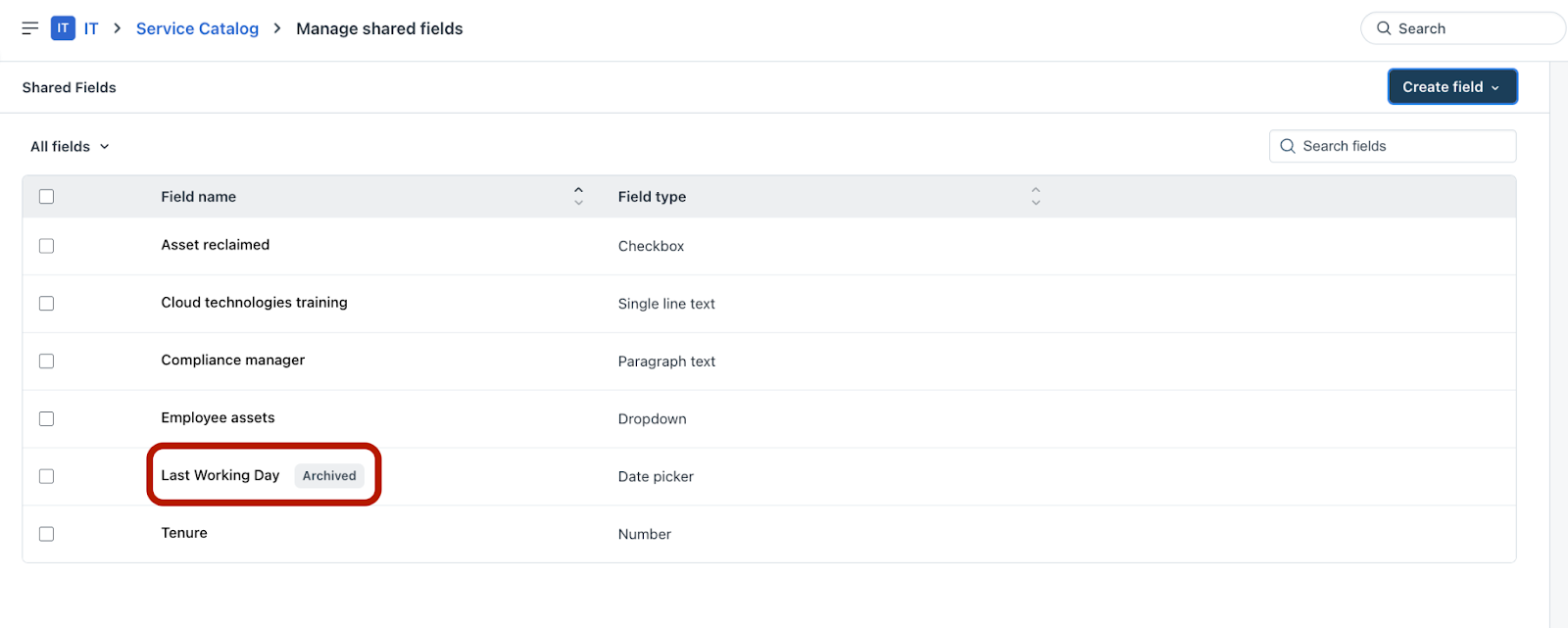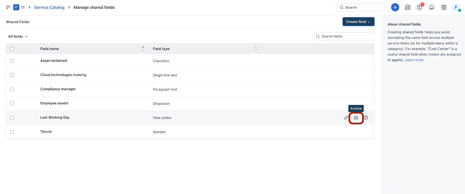 You can also archive, unarchive, or delete shared fields on the service item form page.