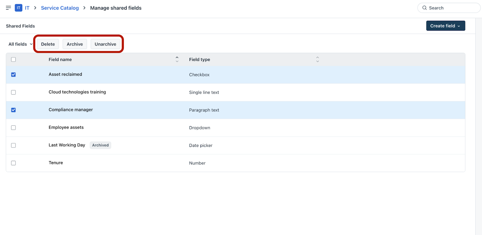 To archive, unarchive, or delete multiple shared fields, select the required fields, then select the relevant option (Delete, Archive, Unarchive).