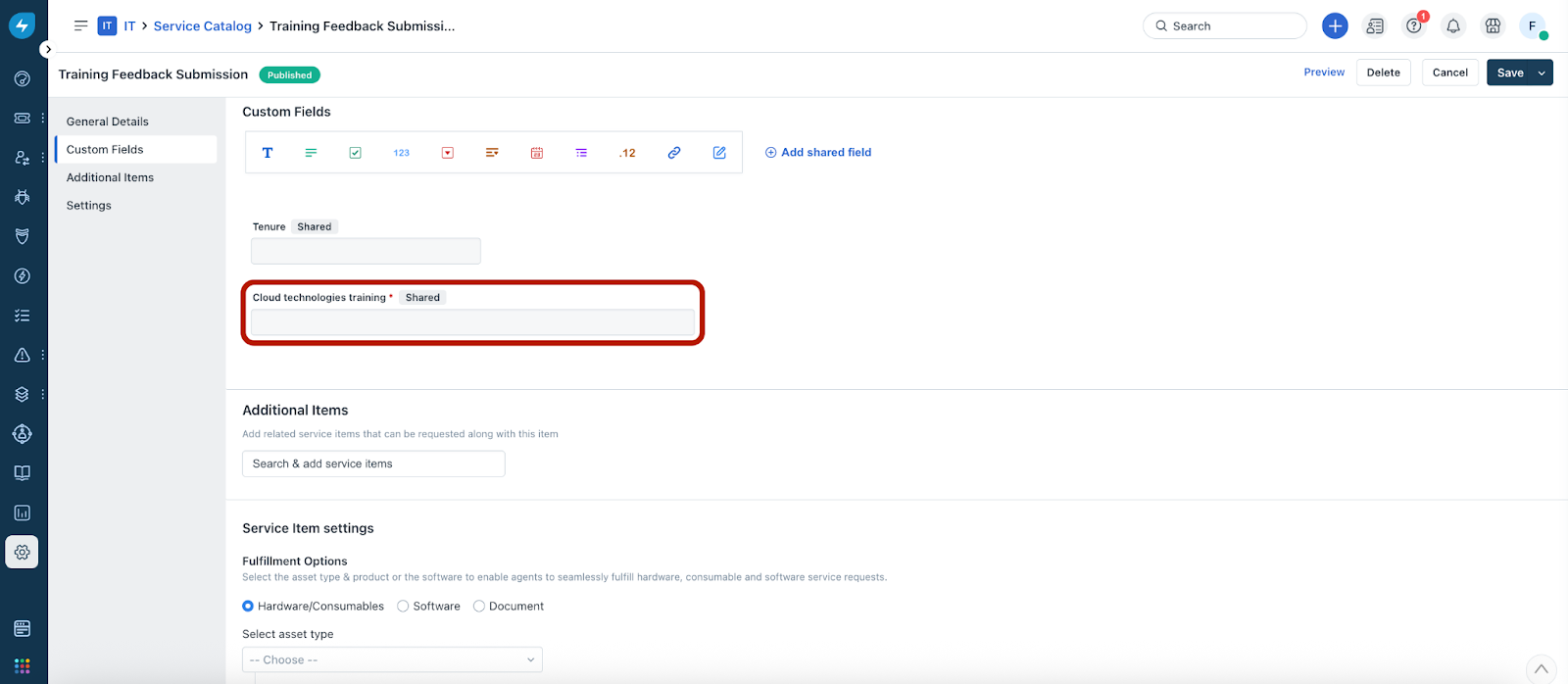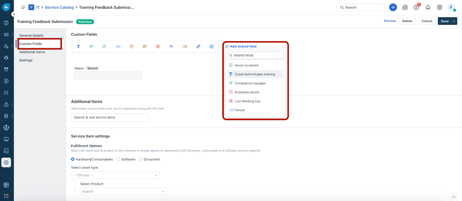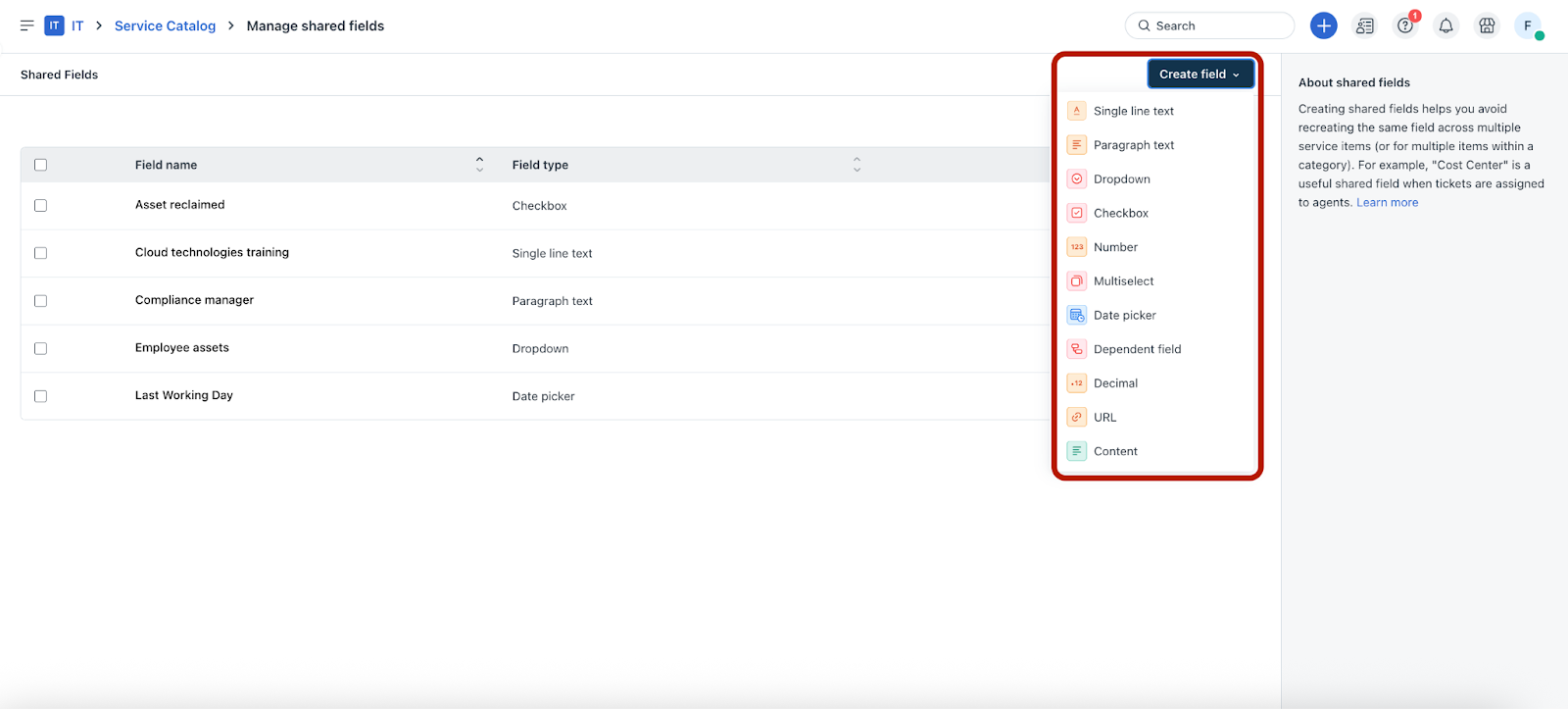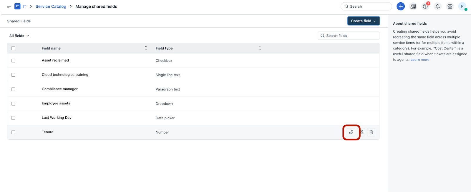 Shared fields offer reusability for service items, so that they can be applied within a specific service item, or across all service items. Shared fields also streamline the process of creating service items by eliminating the need to repeatedly define identical fields across various items.