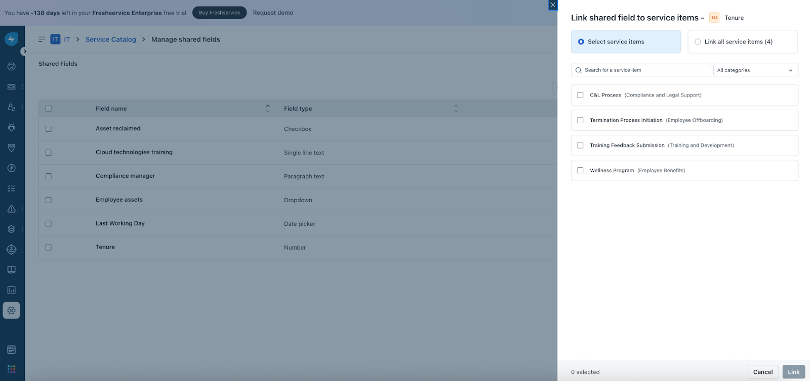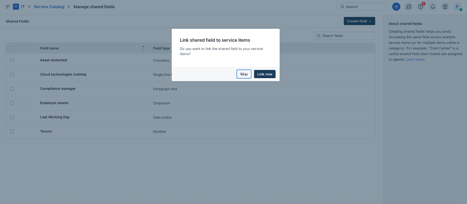 Click Skip or Link now. If you select Link now, the Link shared field to service items - {Field Name} section opens on the right pane.