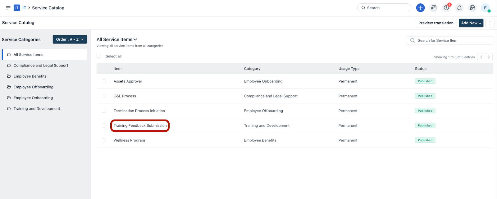 Go to Admin > {Workspace Name} > Service Management > Service Catalog.