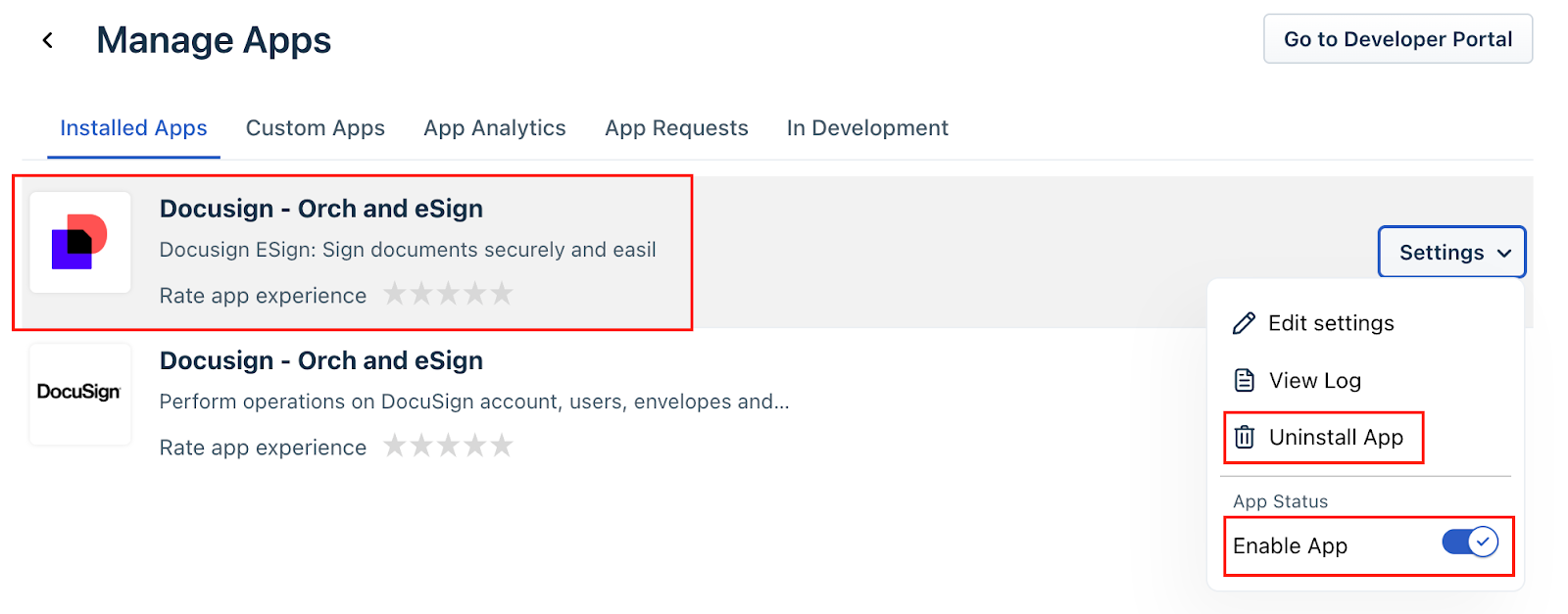 To disable or uninstall the Docusign – Orch and eSign app in Freshservice, follow these steps: