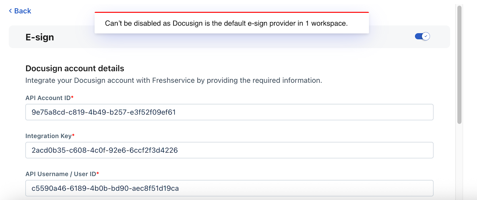 Note: The e-sign toggle cannot be turned off if DocuSign is the workspace default, and will display a warning if there are document templates associated with the app.