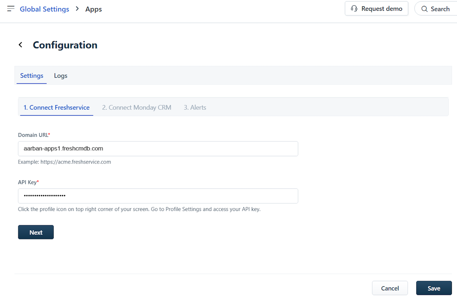 Ensure that your Freshservice API Key is enabled before initiating the installation. Click Next.