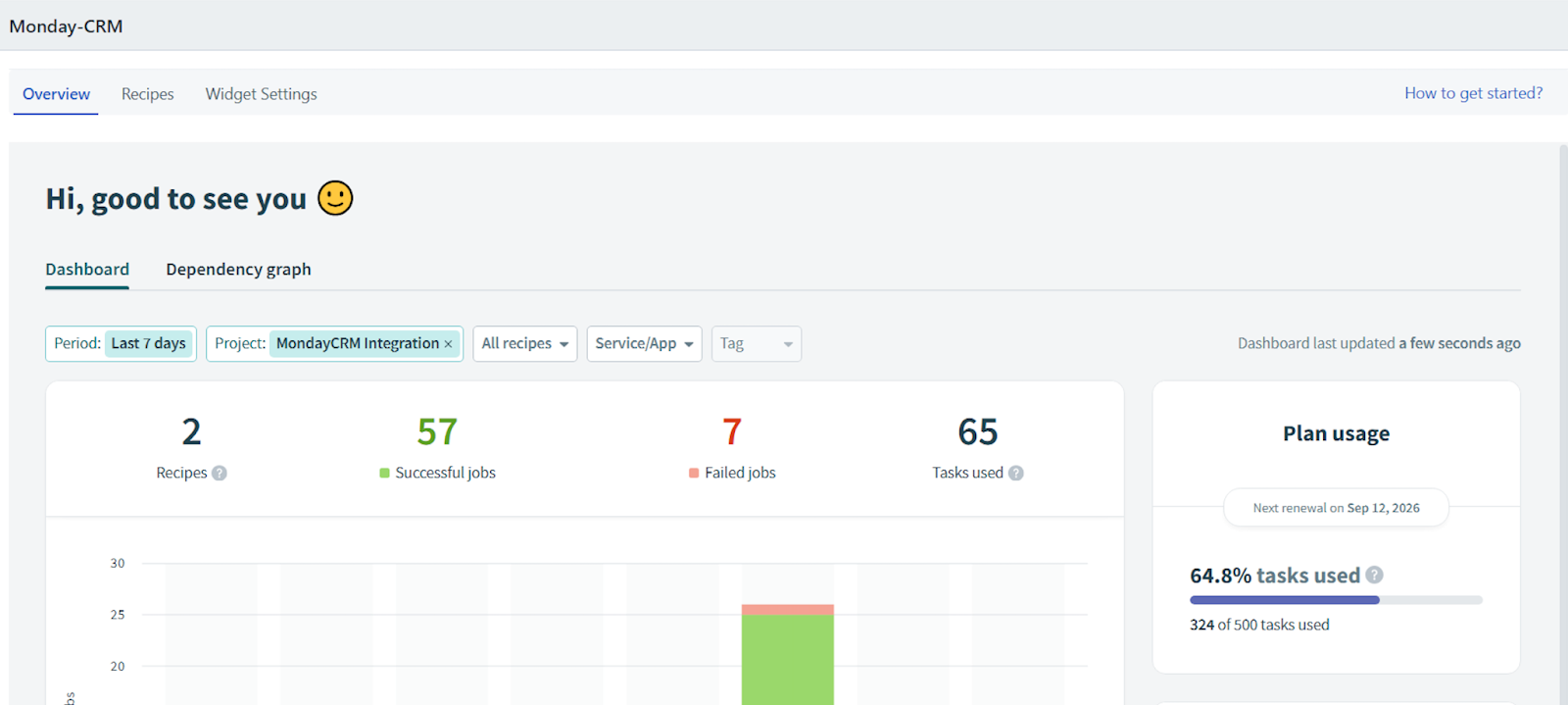 Note: Use the Period, Project, All recipes, Service/App, and Tag filters to modify the graph view. You can also sort and view the required data in a tabular format (below the graph), and view your plan usage and connection details on the Dashboard tab.