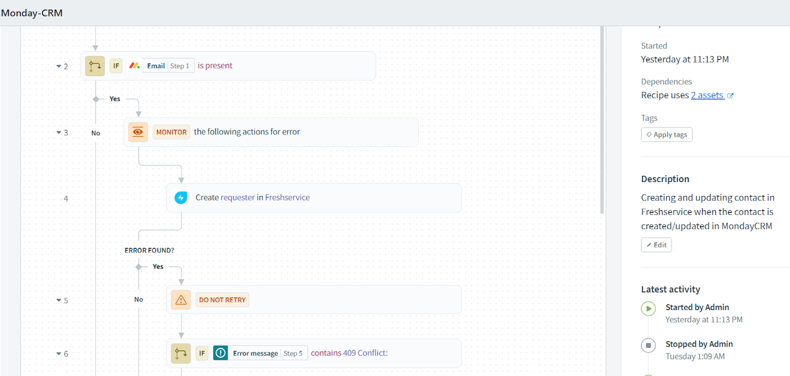 Here, the recipe checks if an employee is onboarded in Monday CRM. Accordingly, an employee record is updated in Freshservice.