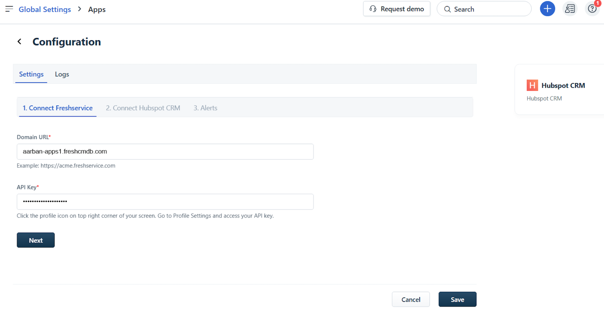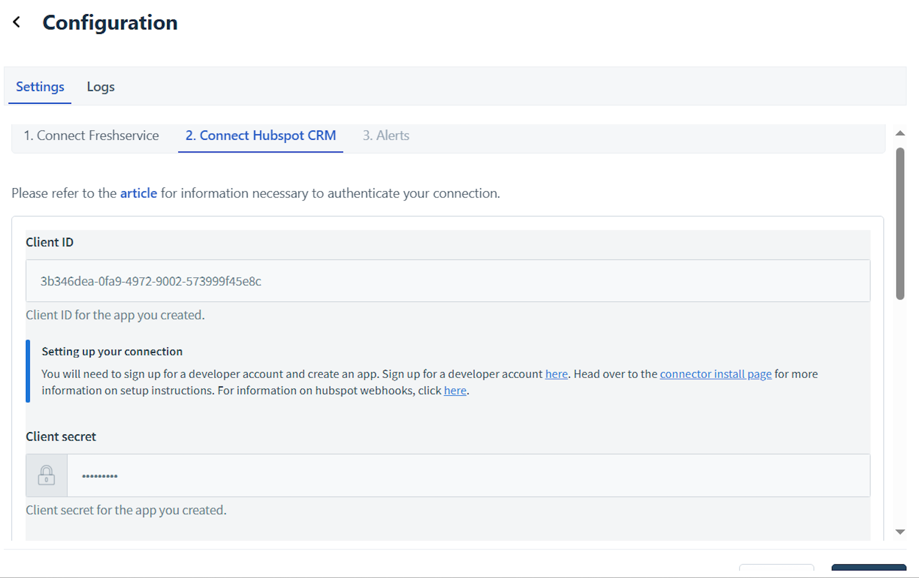 Note: The Domain URL and API Key fields are auto-populated.Enter the relevant Hubspot CRM connection details in the Client ID and Client secret fields. Then, click Connect.