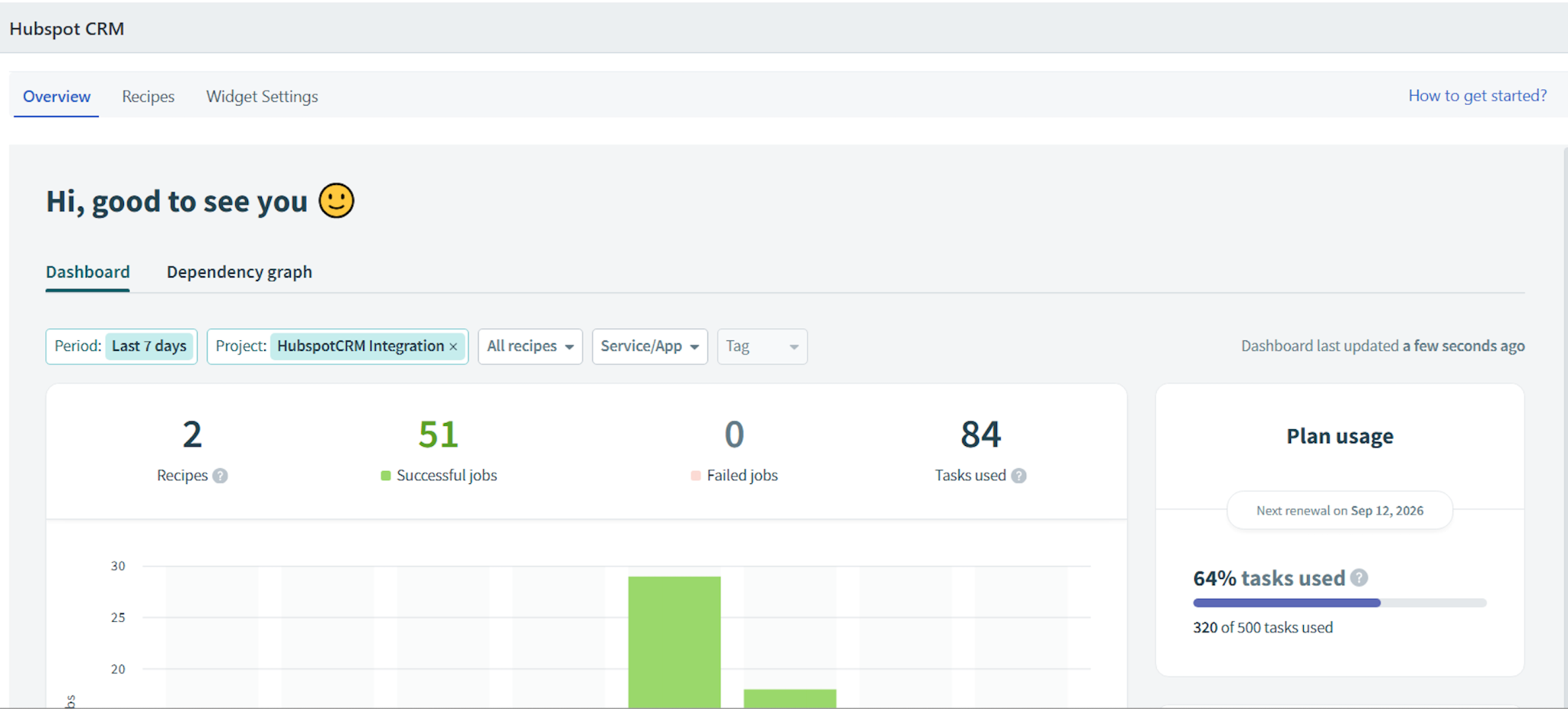 Note: Use the Period, Project, All recipes, Service/App, and Tag filters to modify the graph view. You can also sort and view the required data in a tabular format (below the graph), and view your plan usage and connection details on the Dashboard tab.