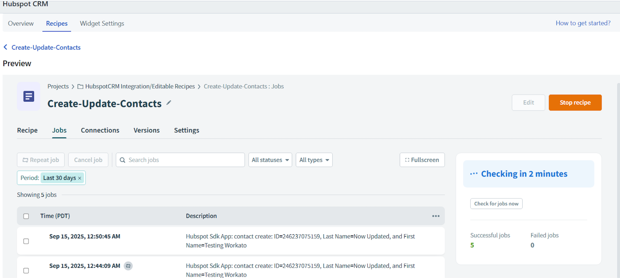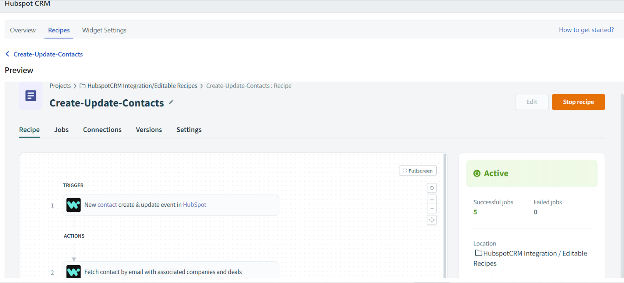 Click Recipes. The Recipes page shows you the list of available recipes for the Hubspot CRM Connector App.