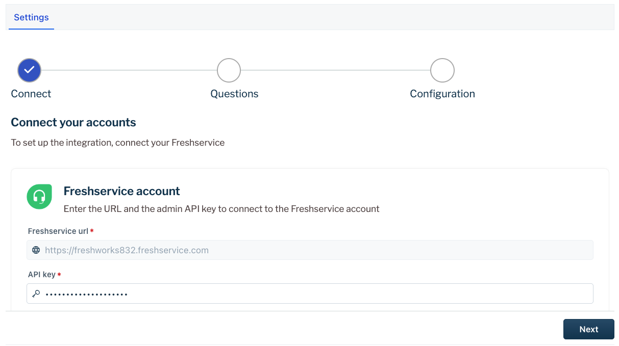 The Freshservice url and API keys are auto-populated. But you can modify the API key field.If you want to update the API key field, enter your API key and click Next.