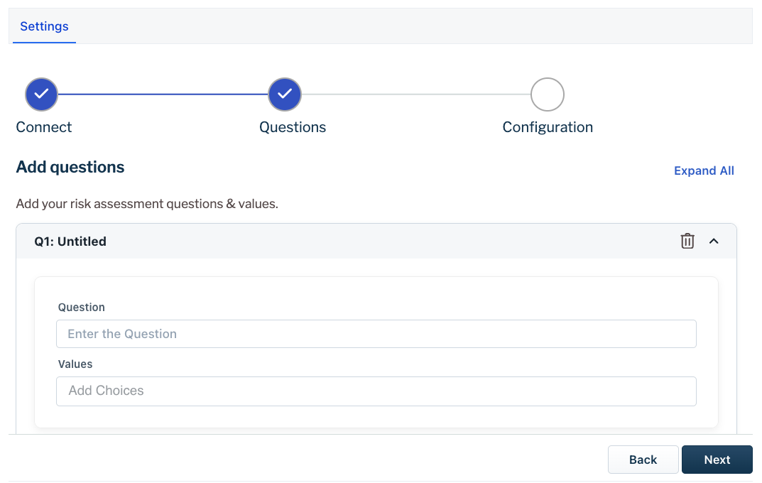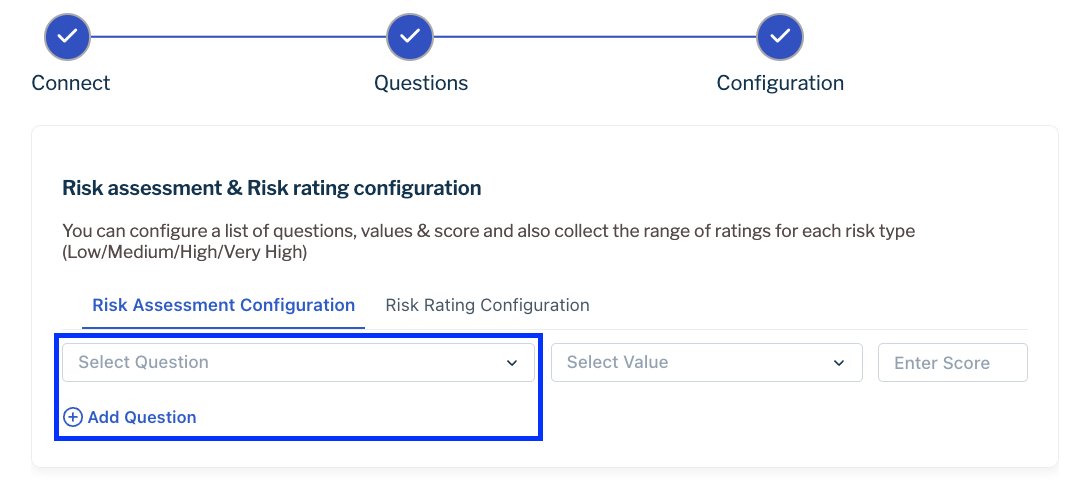 The Risk assessment & Risk rating configuration page appears where you can assign a score and risk key (risk threshold) to each question.Under Risk Assessment Configuration, click + Add Question and select a question from the list of questions you configured.
