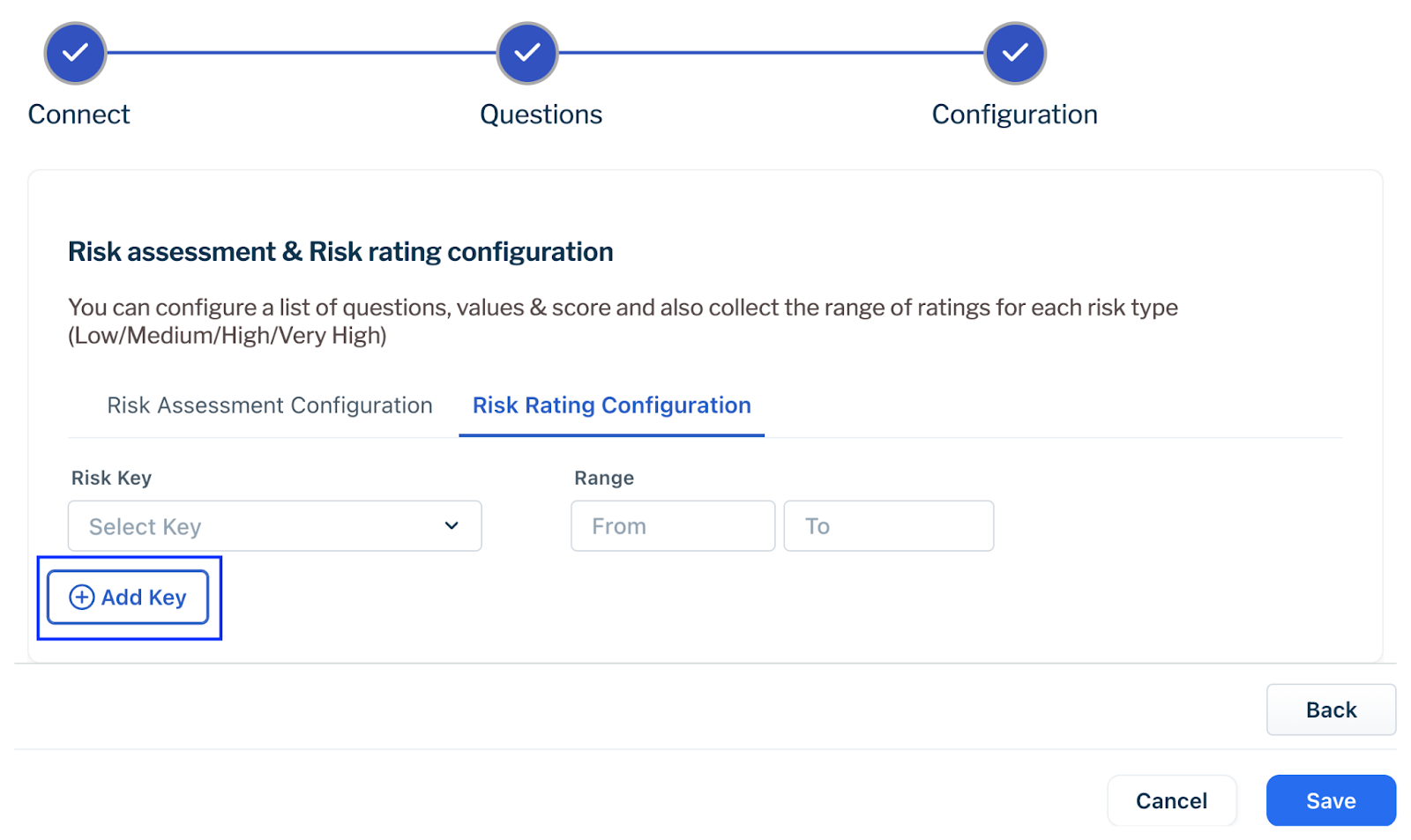 Note - In a row, you can assign a score to only one response value. For example, If your question has three response values and you want to assign scores to all the three response values, then you have to create three rows.Under Risk Rating Configuration, click + Add Key and select a risk key: Low, Medium, High, and Very High.