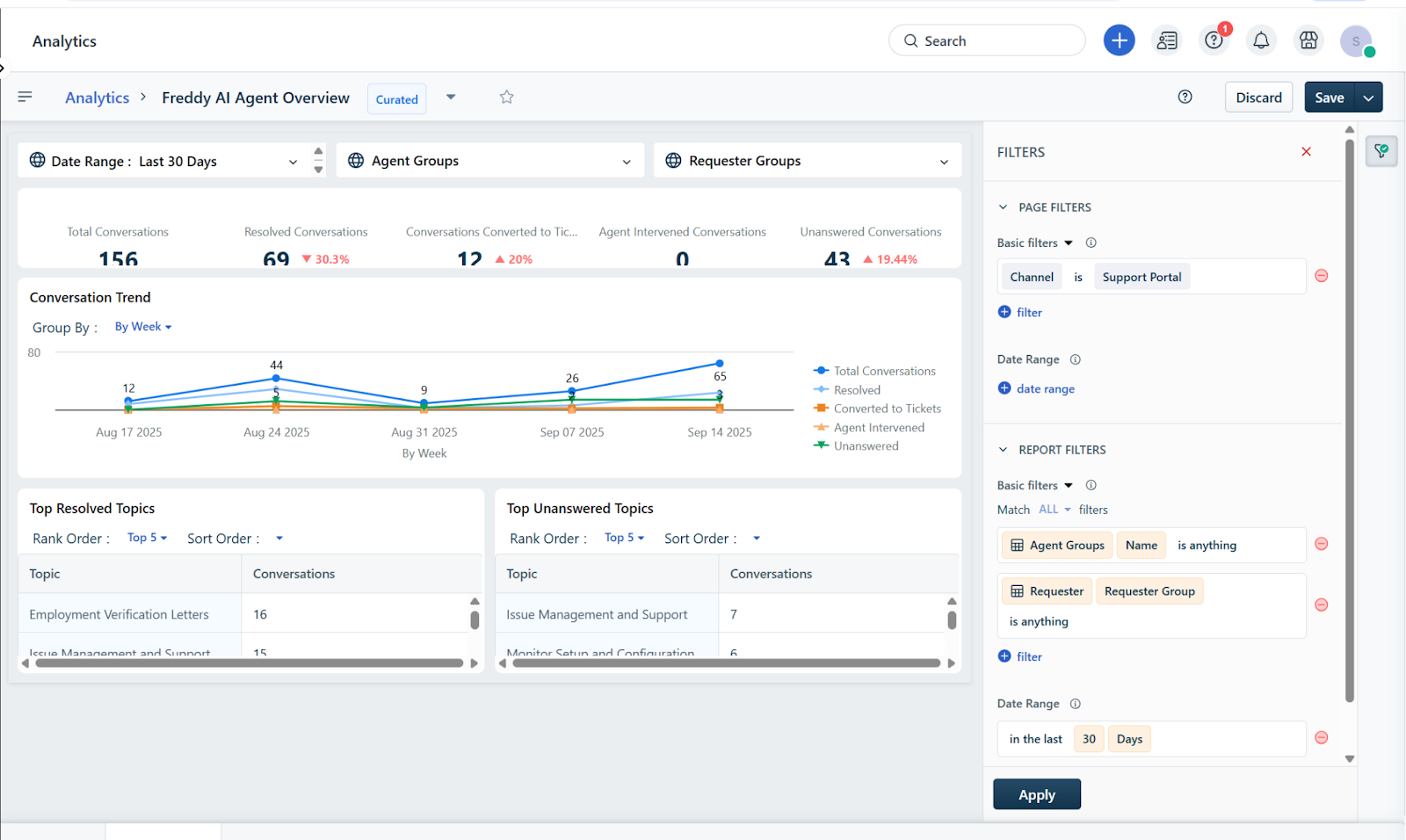 You can monitor the AI Agent’s usage and performance through the Freddy AI Agent Overview report by setting the filter Channel is Support Portal, as shown below. Key metrics include ticket deflection rate, total active users, total conversations, resolved conversations, and employee feedback. For more details, see Track Freddy AI Agent’s usage and metrics.Can we switch Freddy AI Agent on or off anytime?