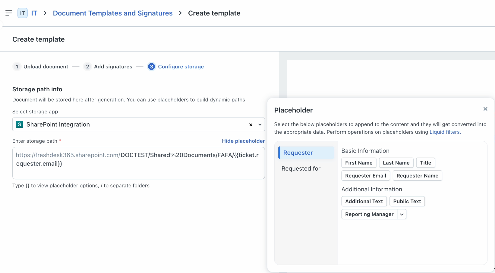 Automate document generation and storage by linking your Freshservice service catalog to specific SharePoint folders.
