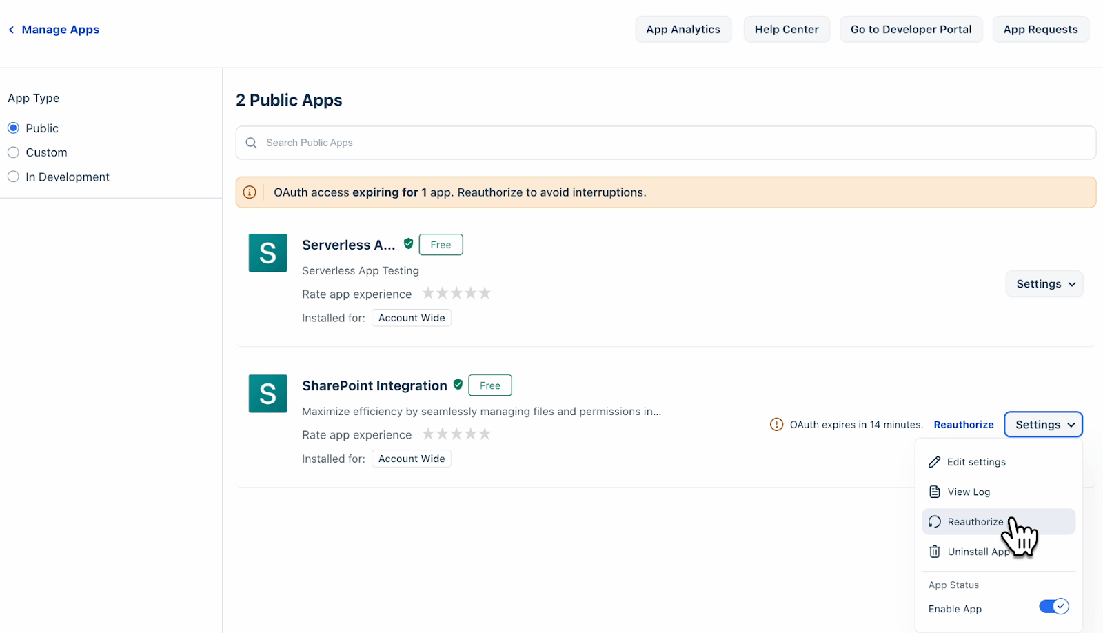 Click Authorize, and then select the Freshservice account you want to integrate. Once authentication is successful, the app status will show authentication successful.