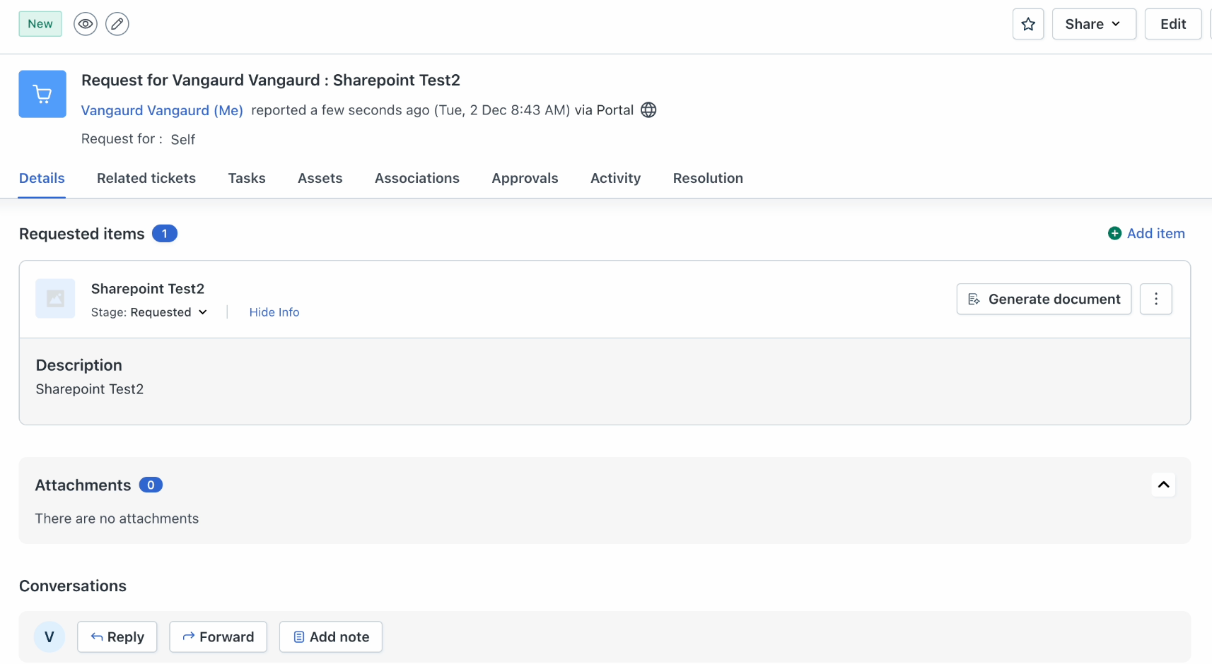 To generate a document, open the ticket and select Generate Document in the Requested Items section. After reviewing the document preview, select Generate and Send. Freshservice generates the document as a PDF and uploads it to the configured SharePoint path. See Auto-save generated documents to SharePoint for more information.
