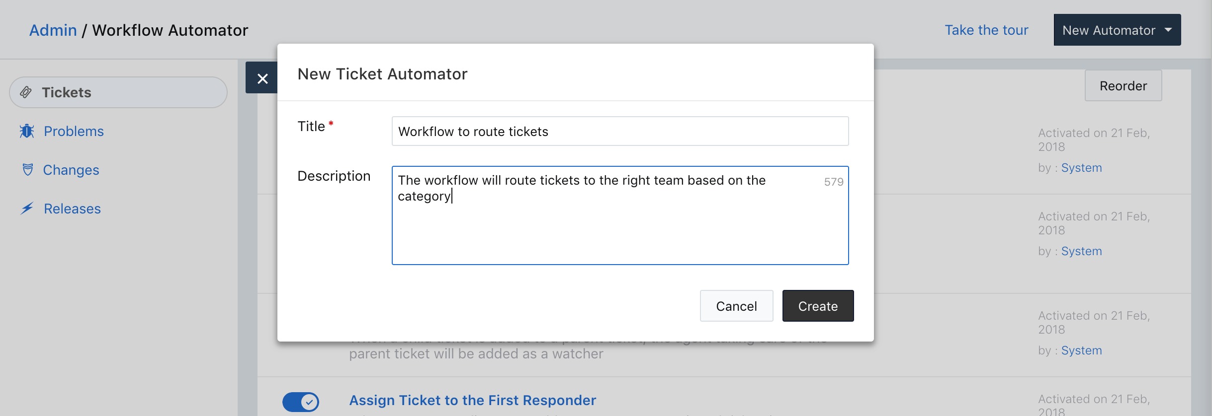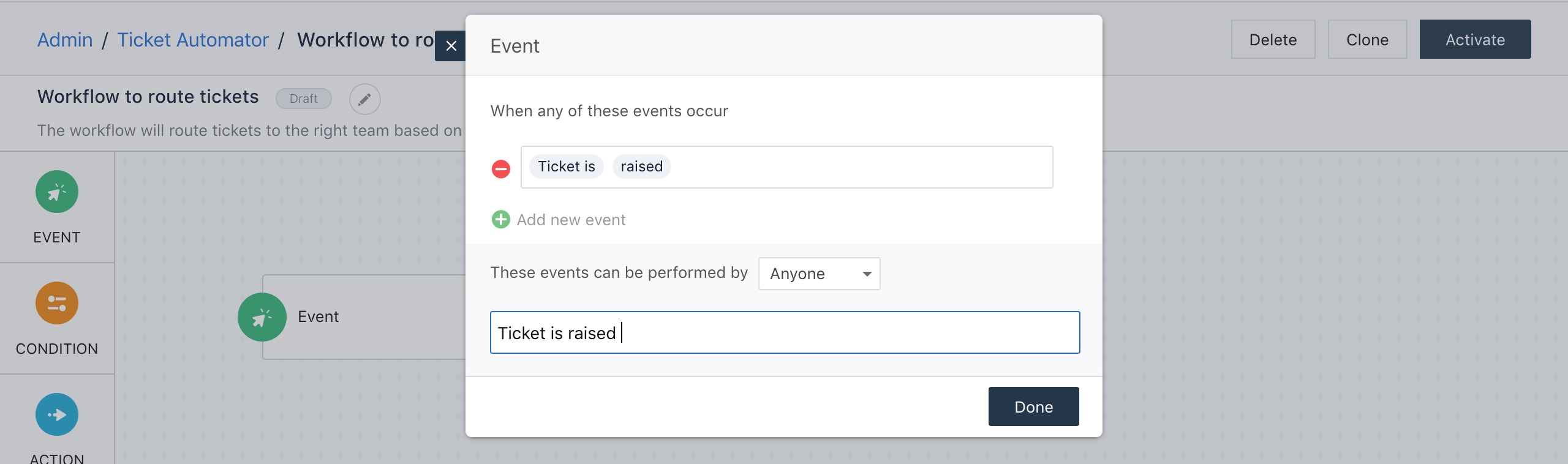 - Head to Admin > Helpdesk Productivity > Workflow Automator > New Workflow > Ticket