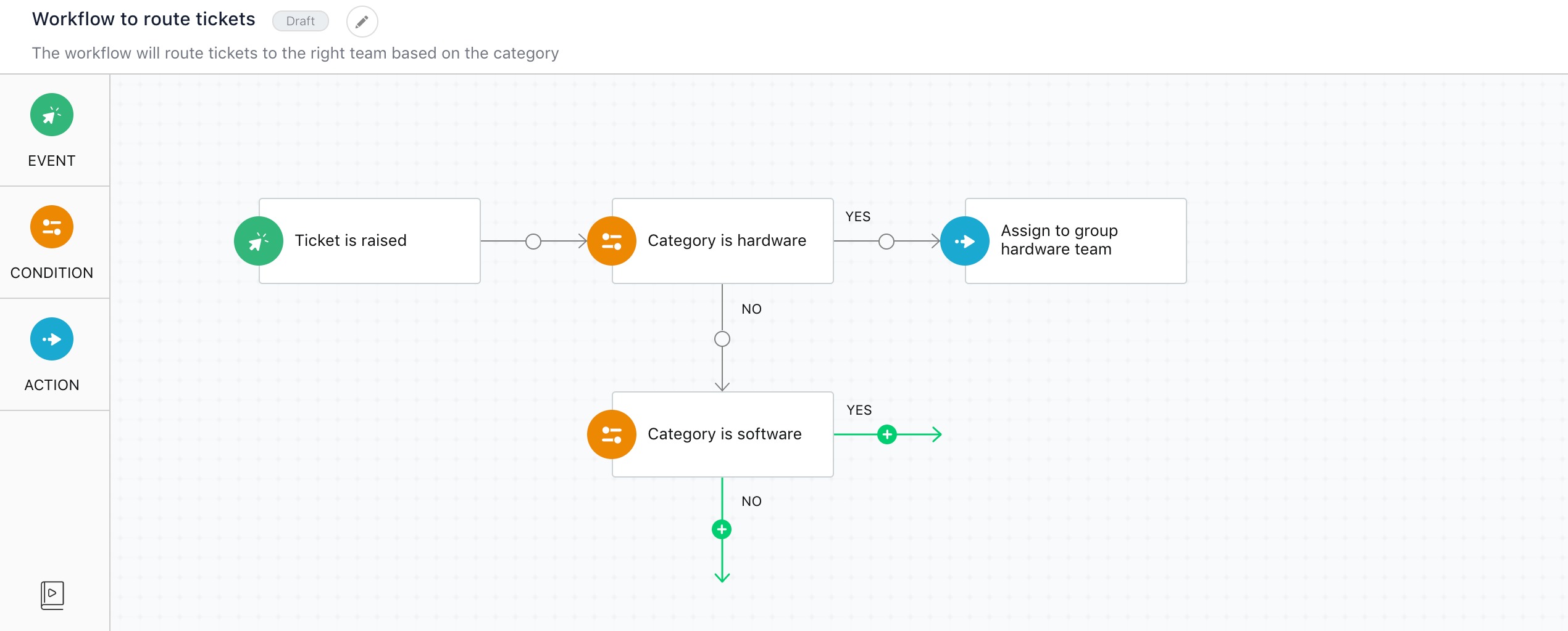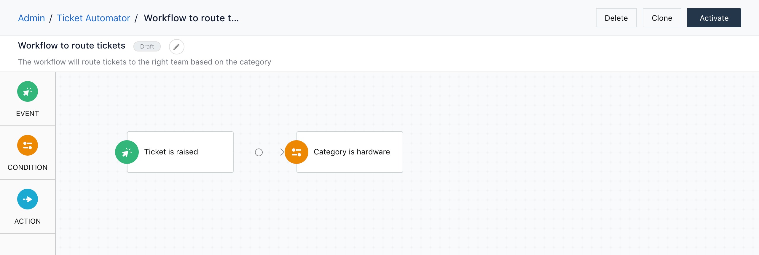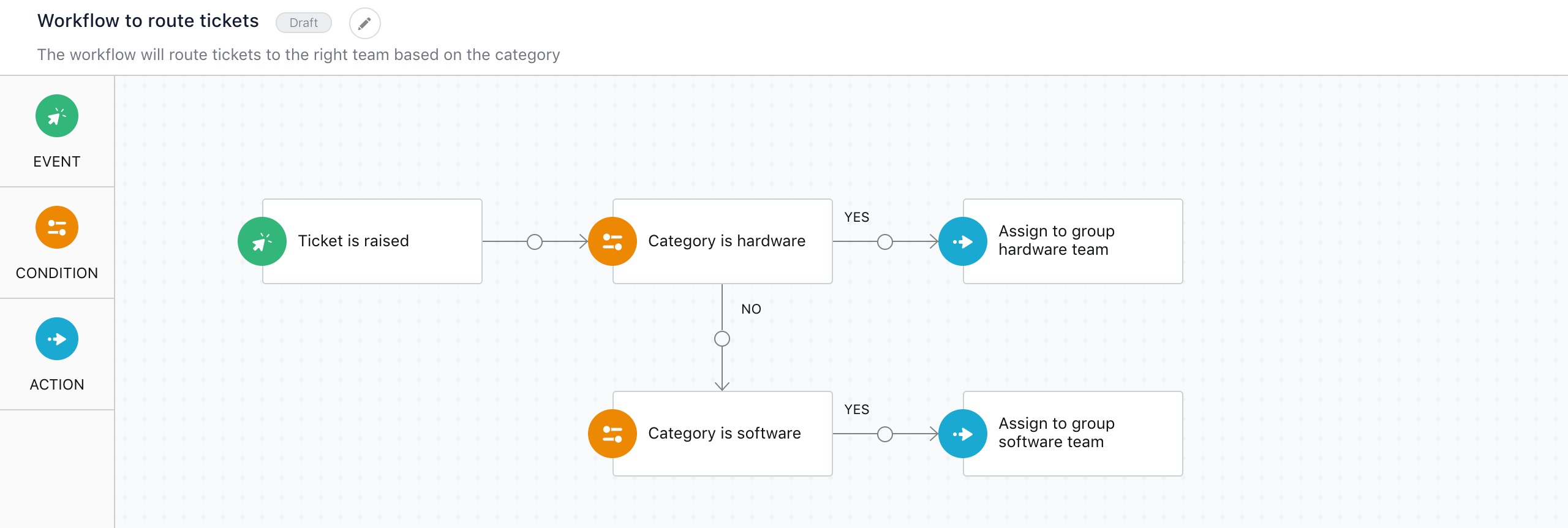 Let’s take a scenario where you wish to route all hardware related tickets to a dedicated hardware team. To convert this into a workflow: