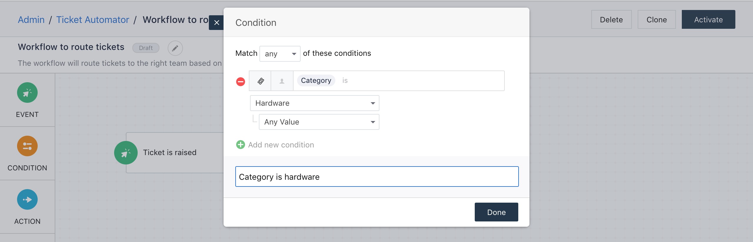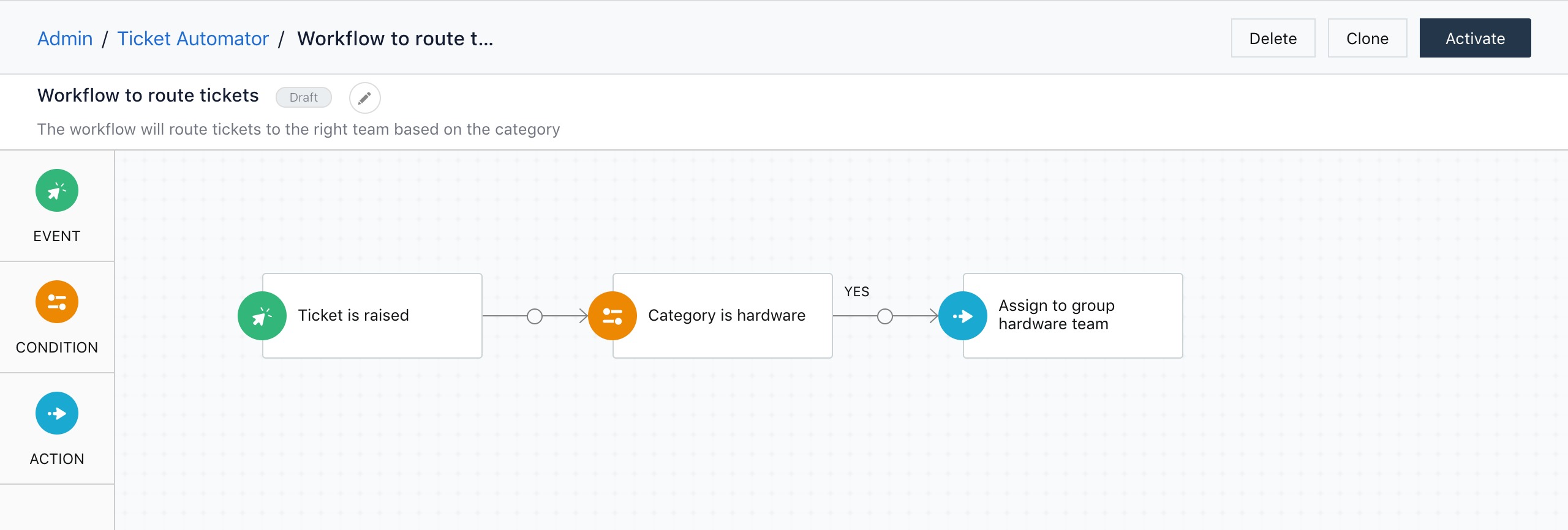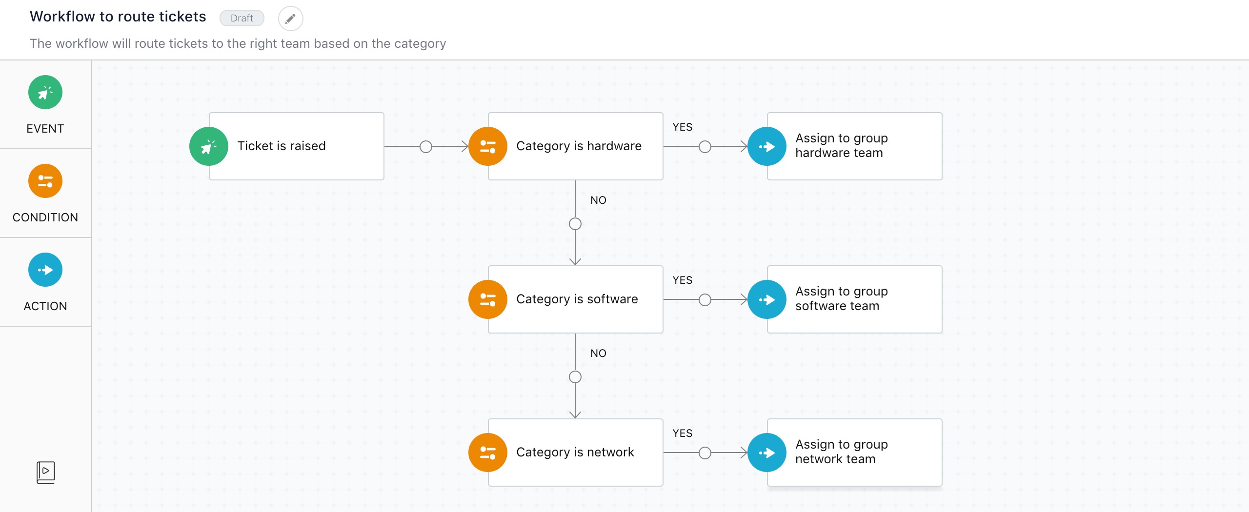 Let’s take a scenario where you wish to route all hardware related tickets to a dedicated hardware team. To convert this into a workflow: