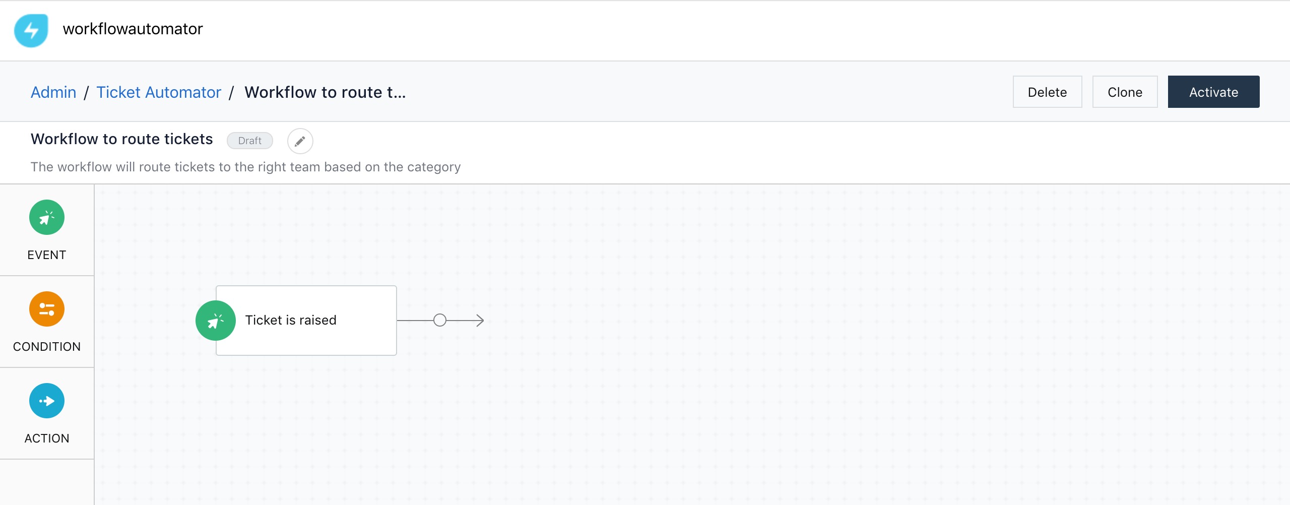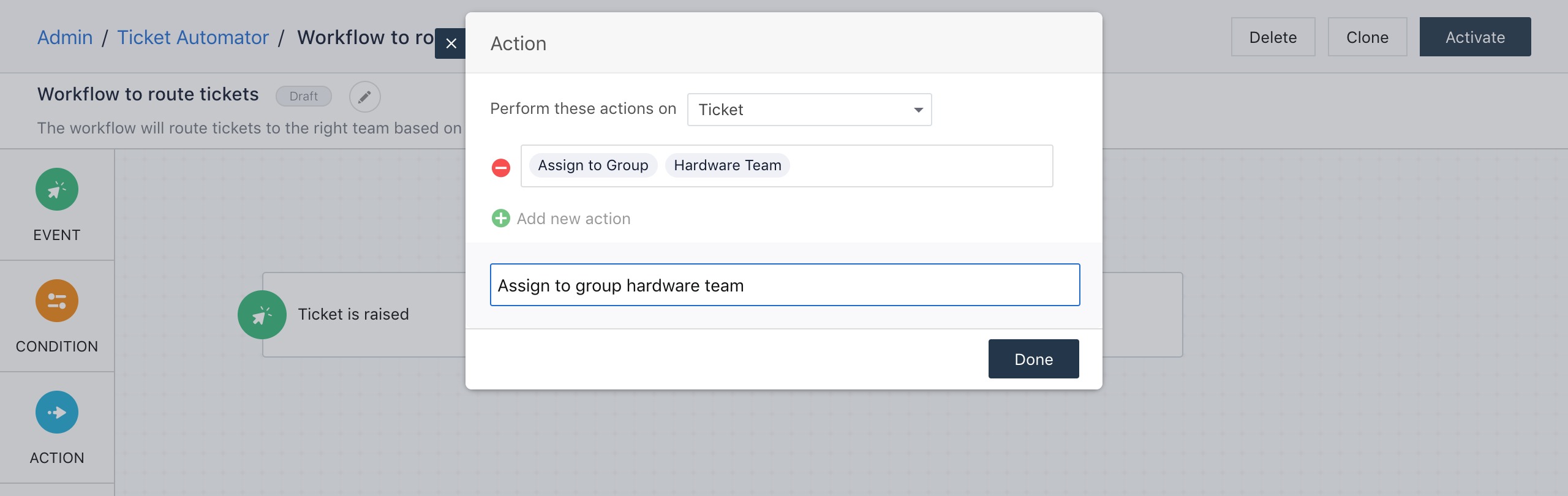 Now, the workflow to assign all hardware related tickets to the hardware team is ready. The workflow will be triggered when a ticket is created and it will check whether the category is ‘hardware’. If yes, then the ticket will be assigned to the hardware to the hardware team.