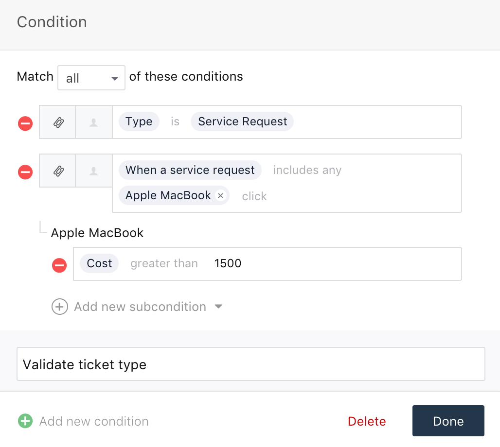 - Add another condition and choose the parameters When a service request includes any Apple Macbook