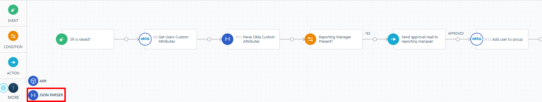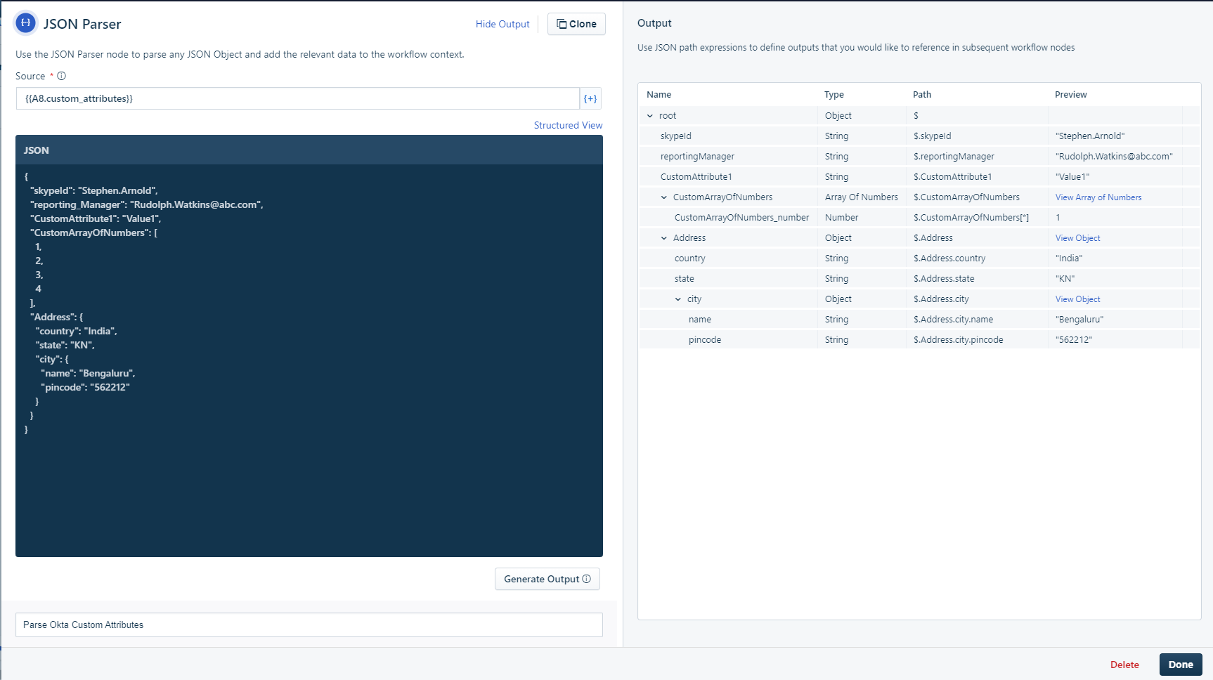 You can use the JSON Parser node right away to work with JSON outputs from app actions that get custom attributes from GSuite, Okta and JIRA... Looking ahead you will also be able to use this to parse rest API responses within the workflow automation. Learn More