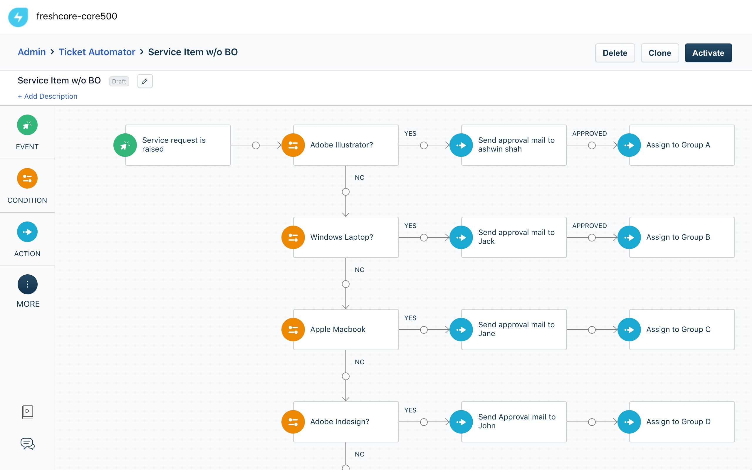 Let’s take a scenario where you want to assign hardware, software, and network-related tickets to hardware, software, and network teams. Let’s take the workflow discussed in the previous scenario and see how we can customize it assign tickets to multiple teams.