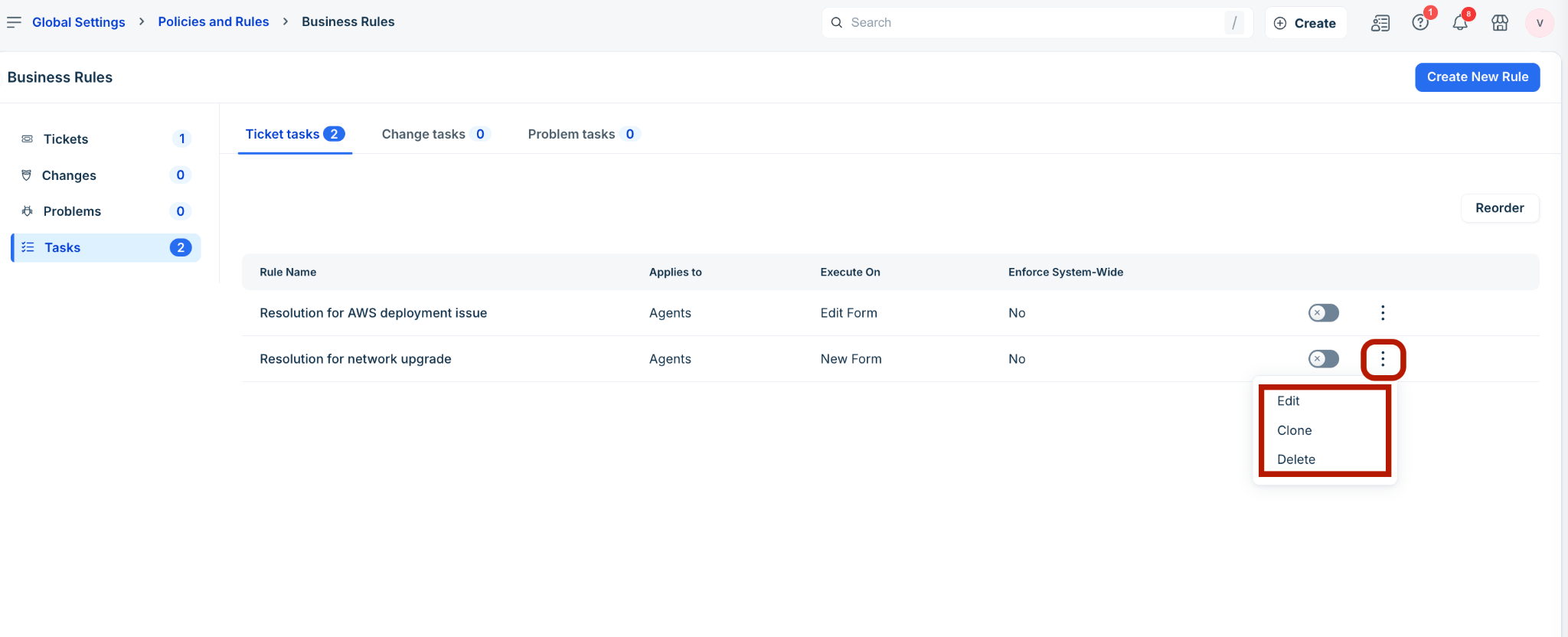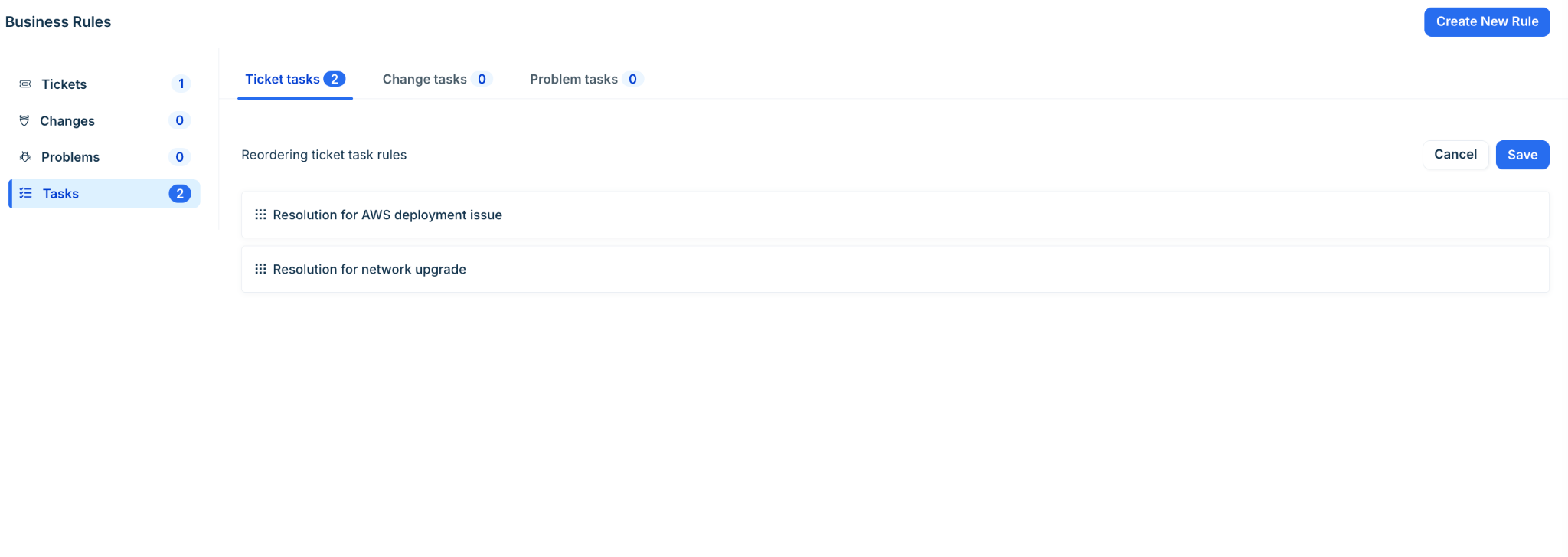 (To edit a business rule) Click any business rule name in a specific tab (Ticket tasks, Change tasks, or Problem tasks).