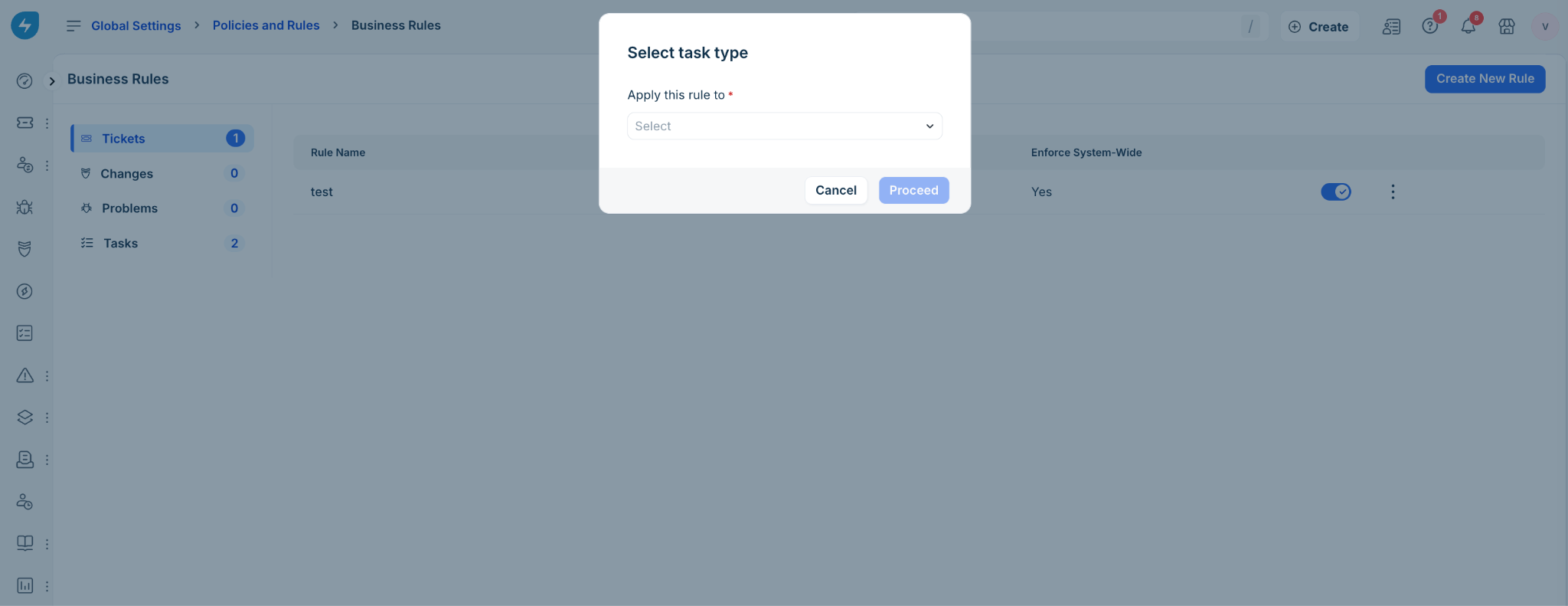 The Tasks business rules that you create at the global level can be configured and managed for Ticket tasks, Change tasks, or Problem tasks.