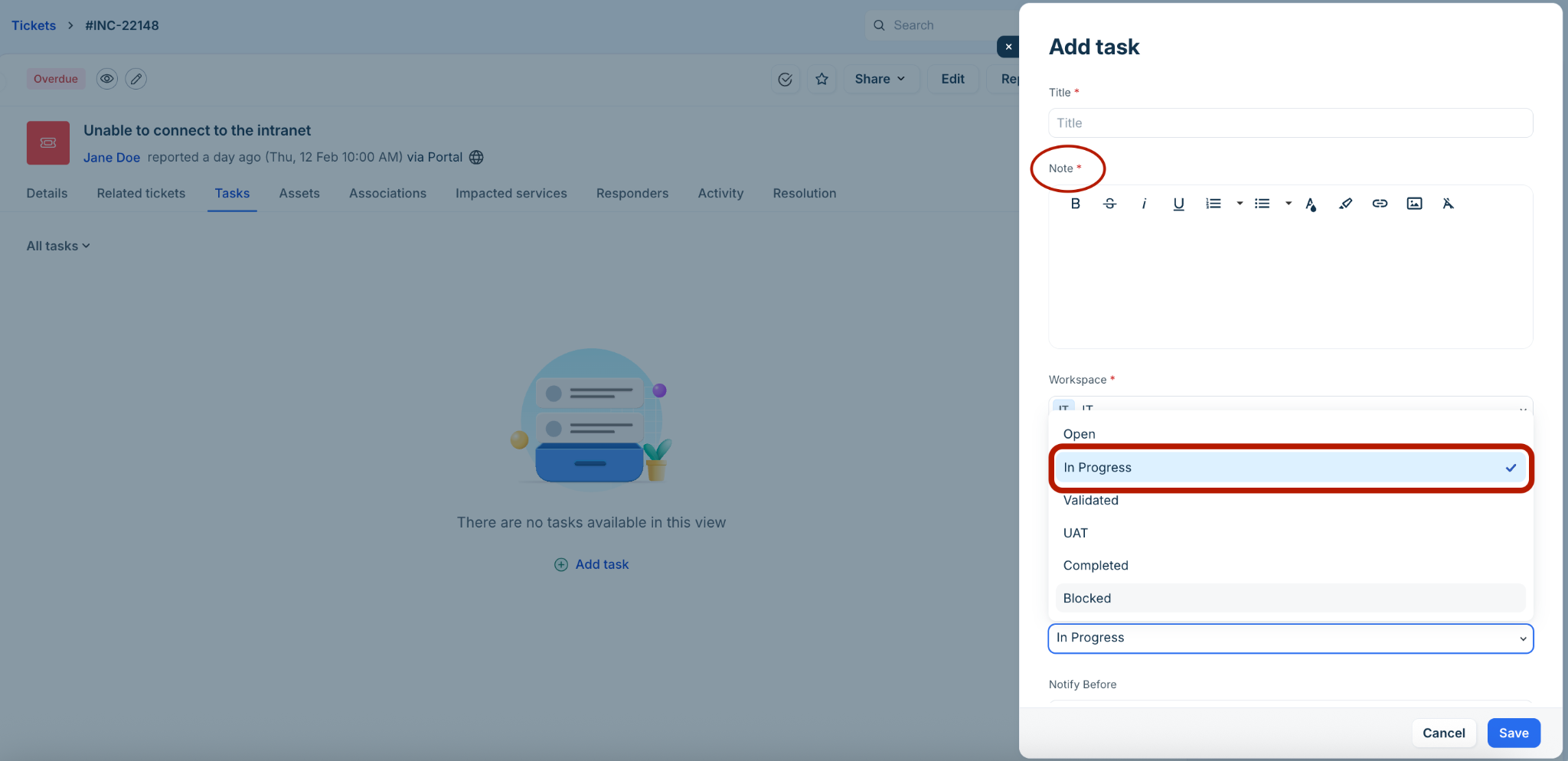 The ‘Note’ field is mandated when the task status is ‘n Progress’.