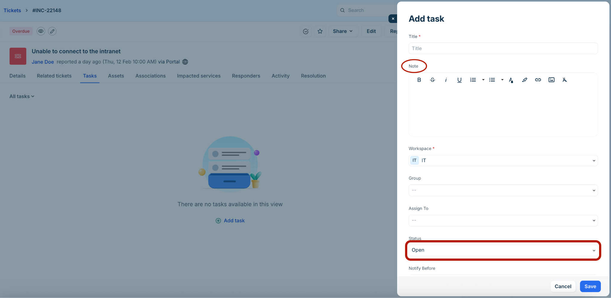 In the Add task slider that opens on the right pane, the ‘Note’ field is not mandated when the task status is ‘Open’.