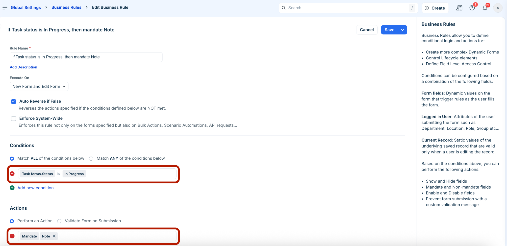 To control field-level actions on a task based on the information available within the same task, business rules can be configured under the Tasks module only at the Global settings level.