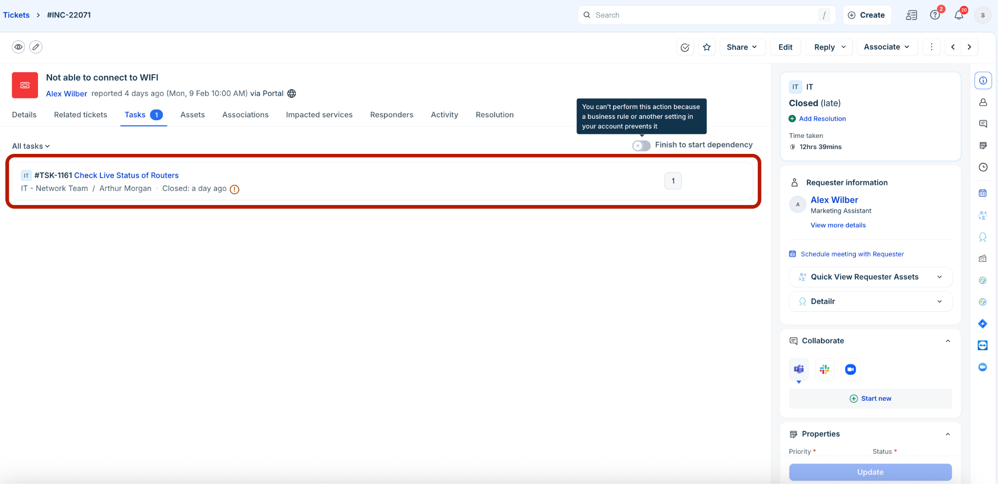 Control across workflows: Ability to hide or disable the Task tab or call-to-actions (CTAs) in workflows where tasks are not relevant. More control on updating tasks when specific restrictions are set (such as, when a ticket is closed or on hold).