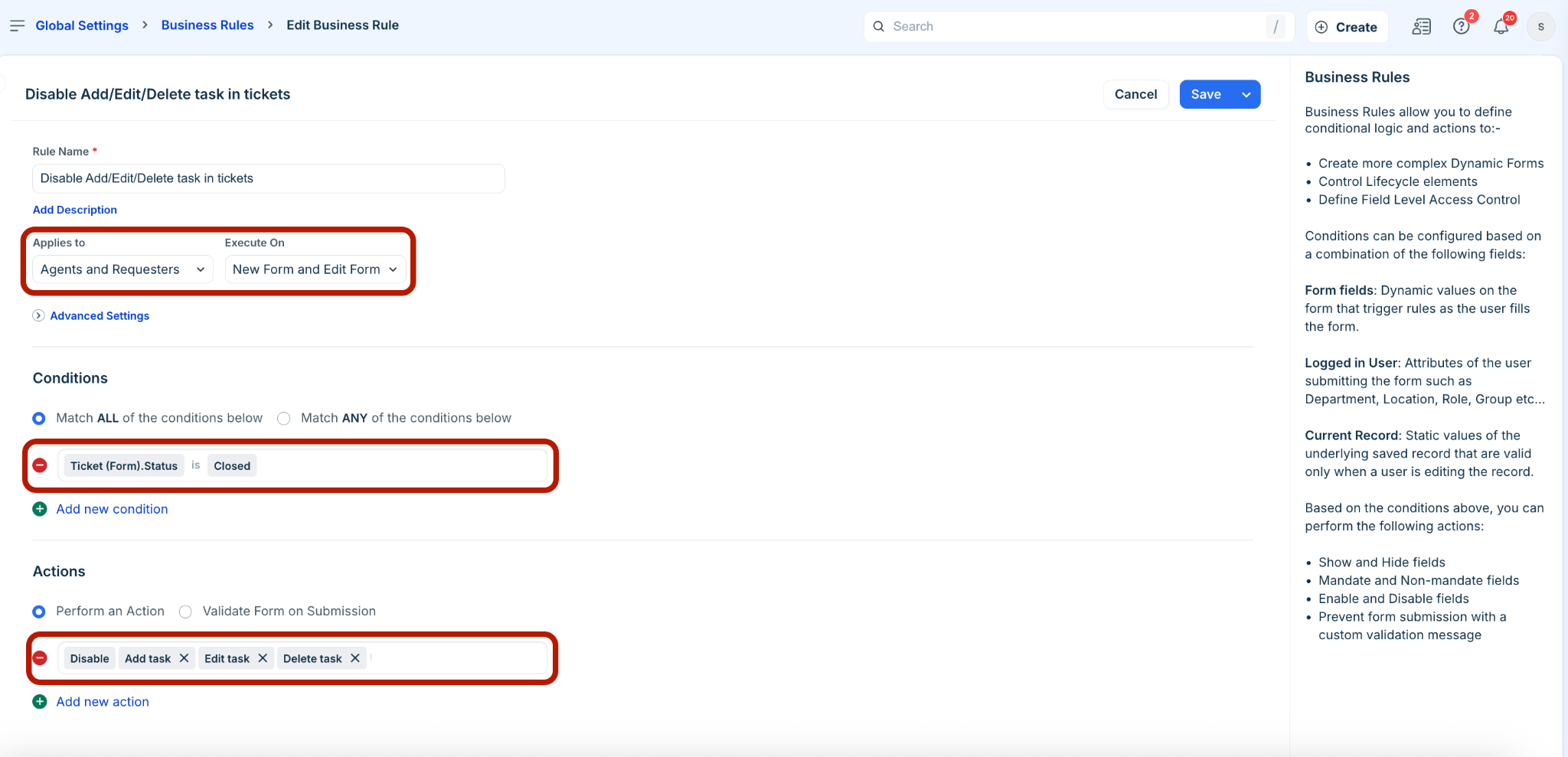 For example, you can set up a business rule for tickets, wherein the ‘Add task’, ‘Edit task’, and ‘Delete task’ options are disabled in new and existing ticket forms with ‘Closed’ status for both agents and requesters.