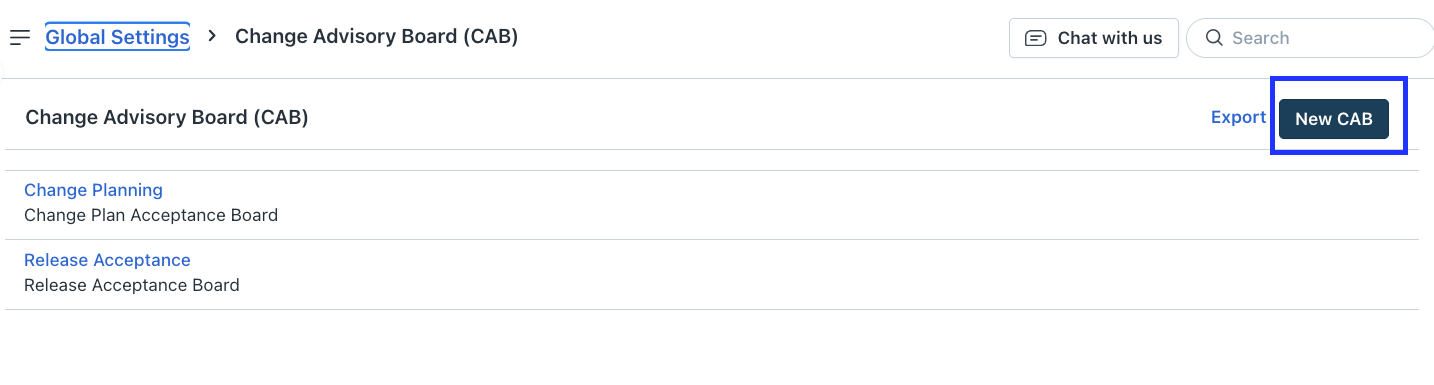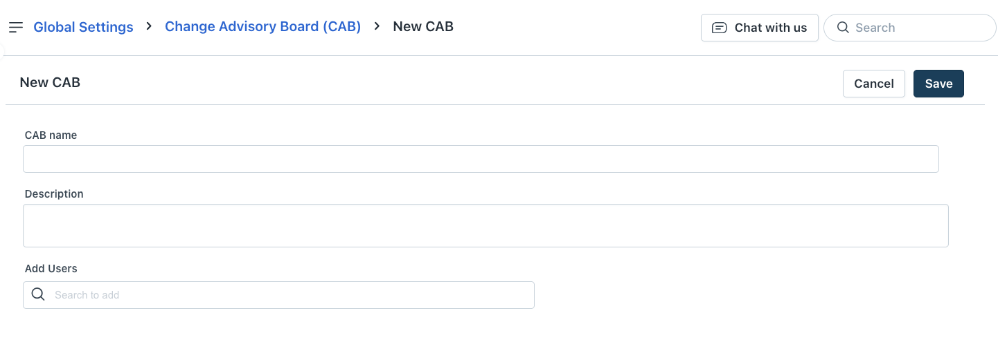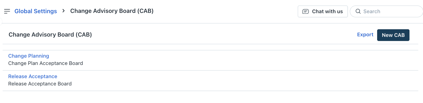 After you create a CAB, it appears on Admin > Global Settings > Change Advisory Board (CAB) page. You can open a CAB and make any modifications such as adding new team members or deleting an existing CAB member.