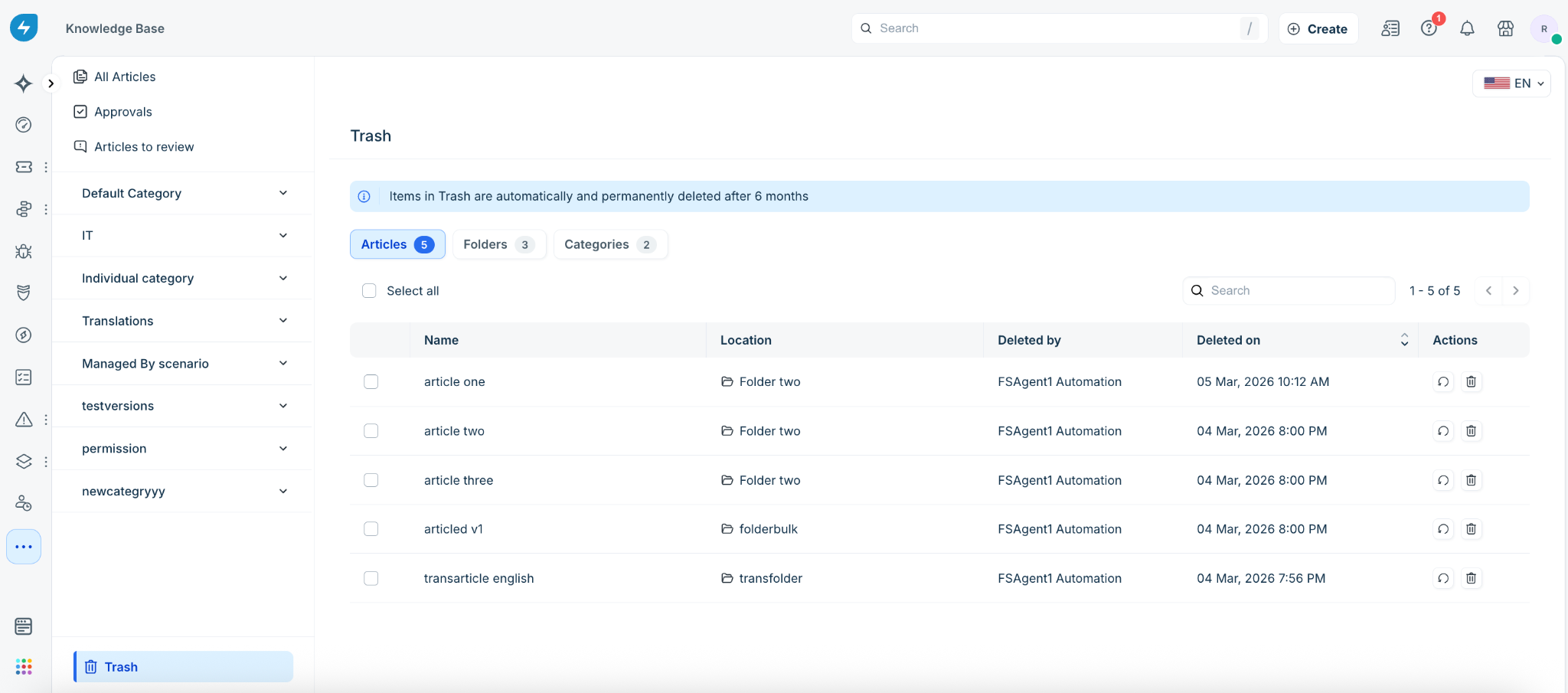 Whether it’s a single article or an entire category, you now have the control to undo deletions instantly, keeping your IT and business processes running smoothly.