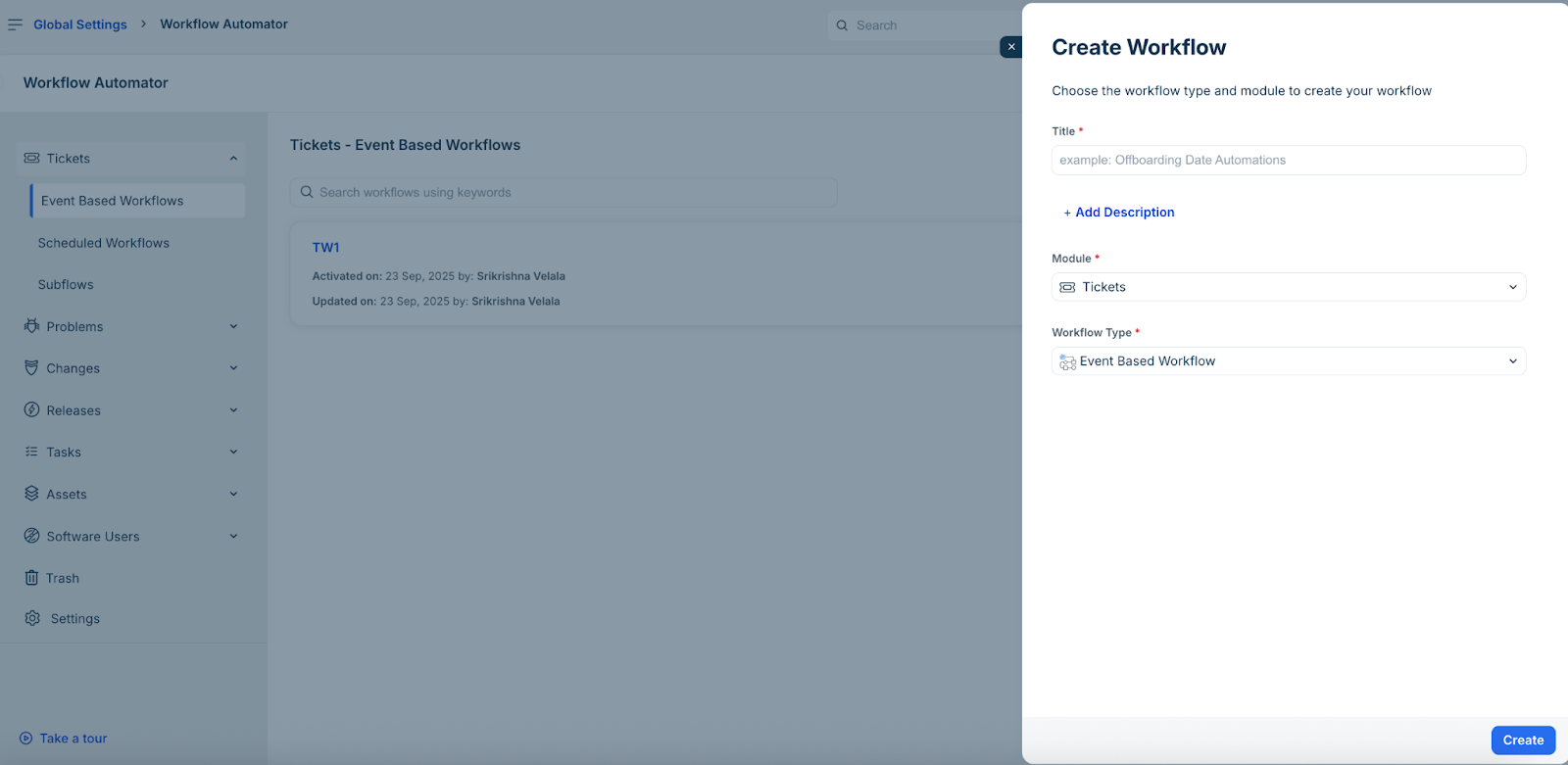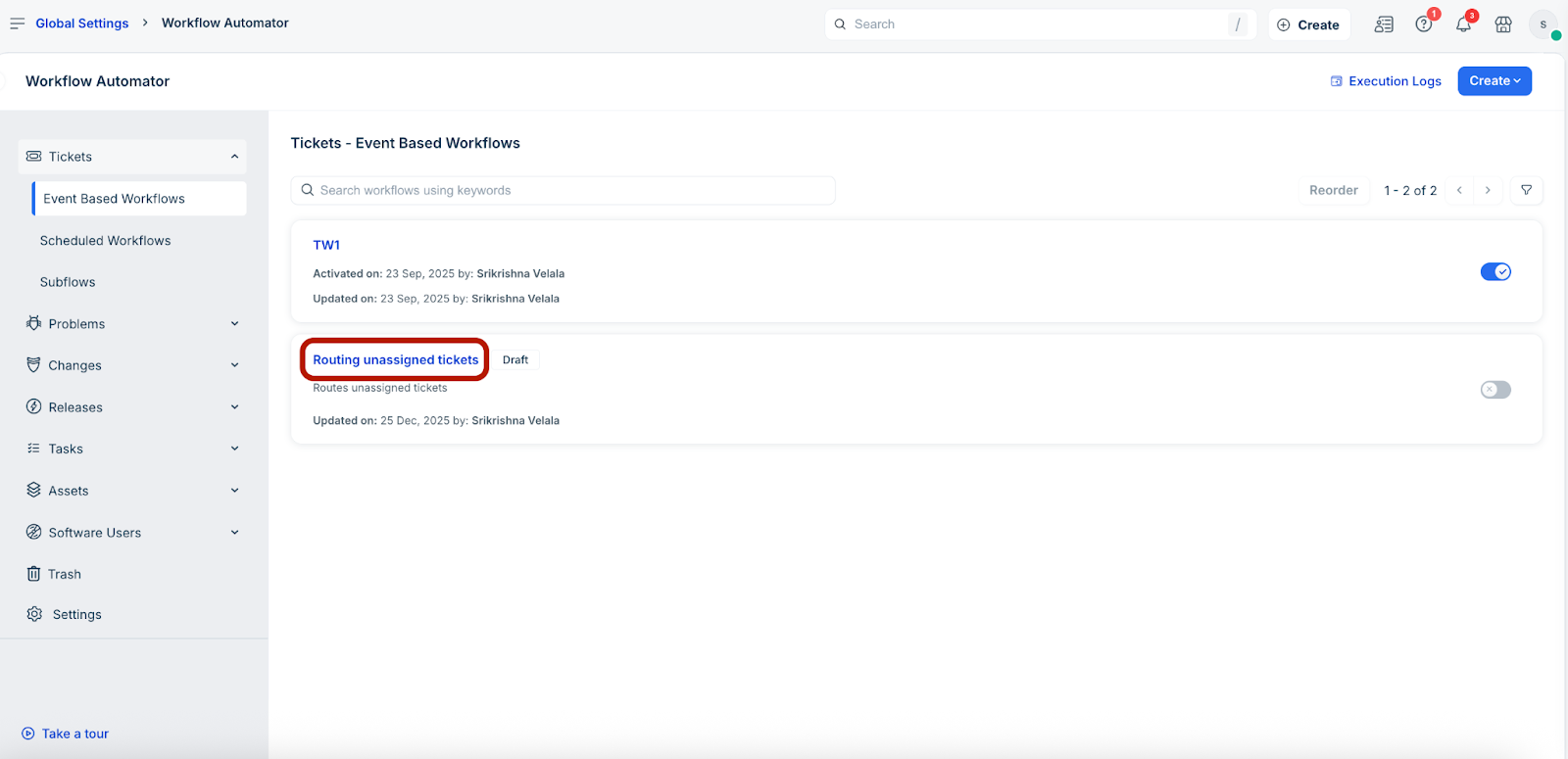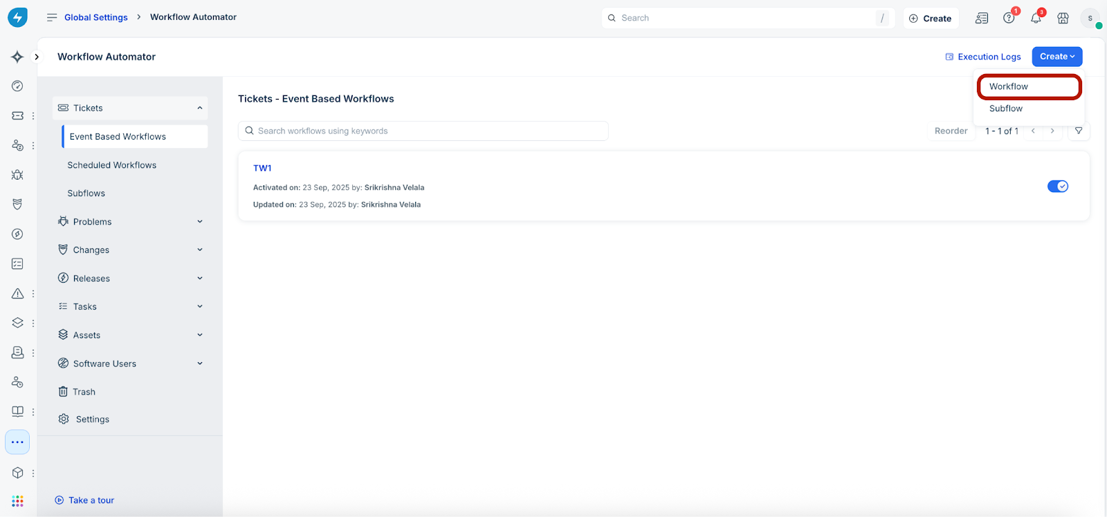Select the relevant workflow module and type on the left pane (for example, Tickets > Event Based Workflows). The list of event based workflows for the Tickets module is displayed.